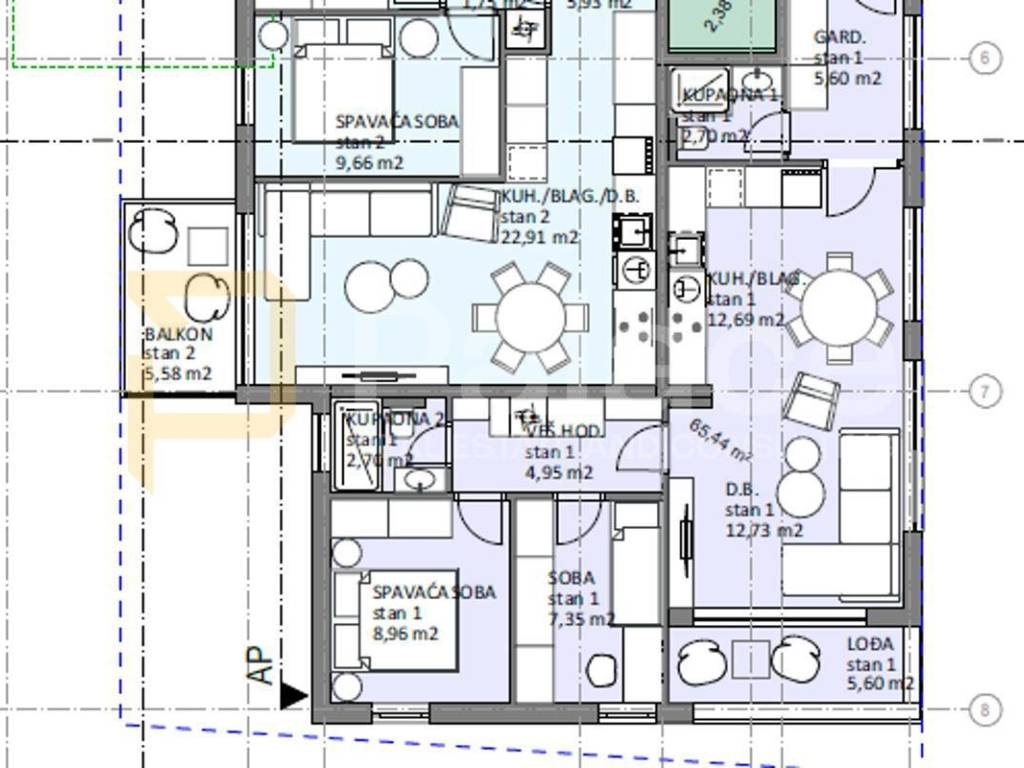 The building is being constructed according to the latest trends, meaning it will have an elevator with access to all apartments, garages with storage rooms in the basement of the building where the elevator goes. The equipment will be made of the highest quality materials in line with today's standards. Aluminum triple-glazed windows, underfloor heating in the bathrooms, pre-installation for underfloor heating in the living area, split air conditioning units, security doors, video/intercom system, quality ceramics, bedroom floors.
