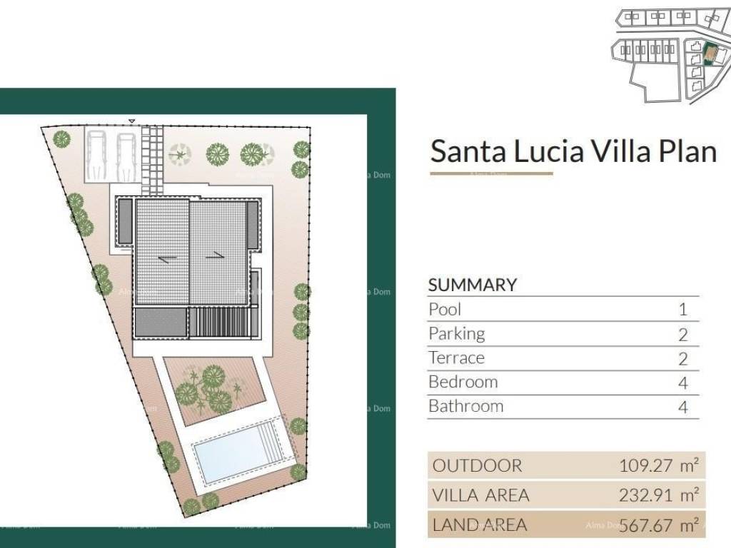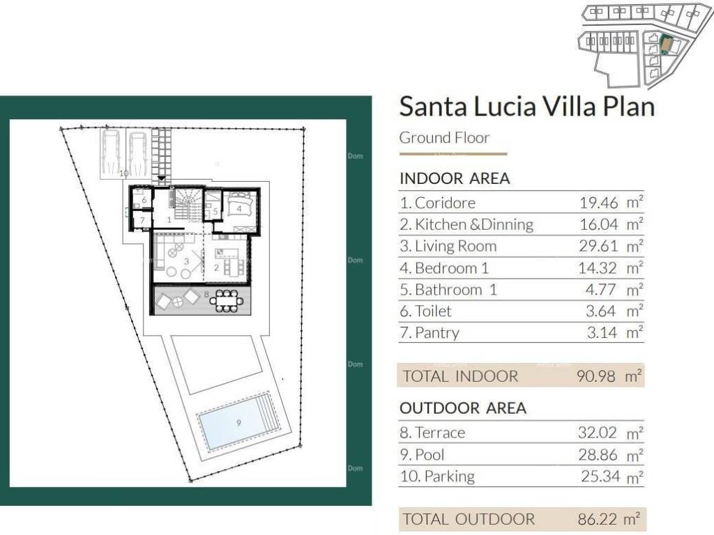 Villa C11, with a total area of 274.16 m2, consists of a ground floor and a first floor. On the ground floor there is a hallway, living room, kitchen with dining room, bathroom, 2 bedrooms, storage room.
