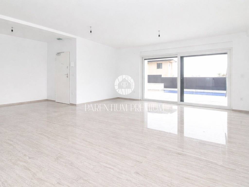 The apartment features a functional and modern layout and consists of three bedrooms, one of which has its own en-suite bathroom, an additional shared bathroom, and a spacious open-plan living area combining the kitchen, dining area, and living room. From the living area, there is direct access to a covered terrace and a private garden with a swimming pool, perfect for relaxation and enjoying the warmer months.