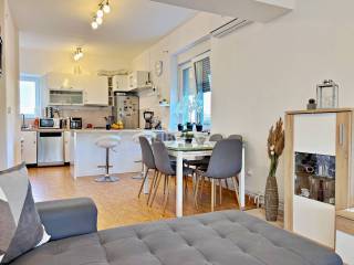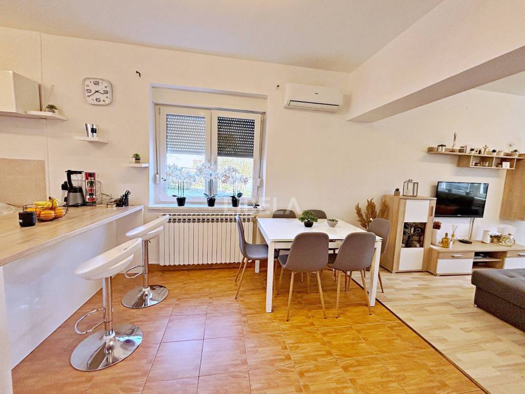 Stan se sastoji od dnevnog boravka s blagovaonicom i kuhinjom, 2 spavaće sobe, kupaonice s WC-om i ulaznog hodnika. Stanu pripada i spremište u podrumu (8m2) i garaža a moguće je parkiranje i u dvorištu.