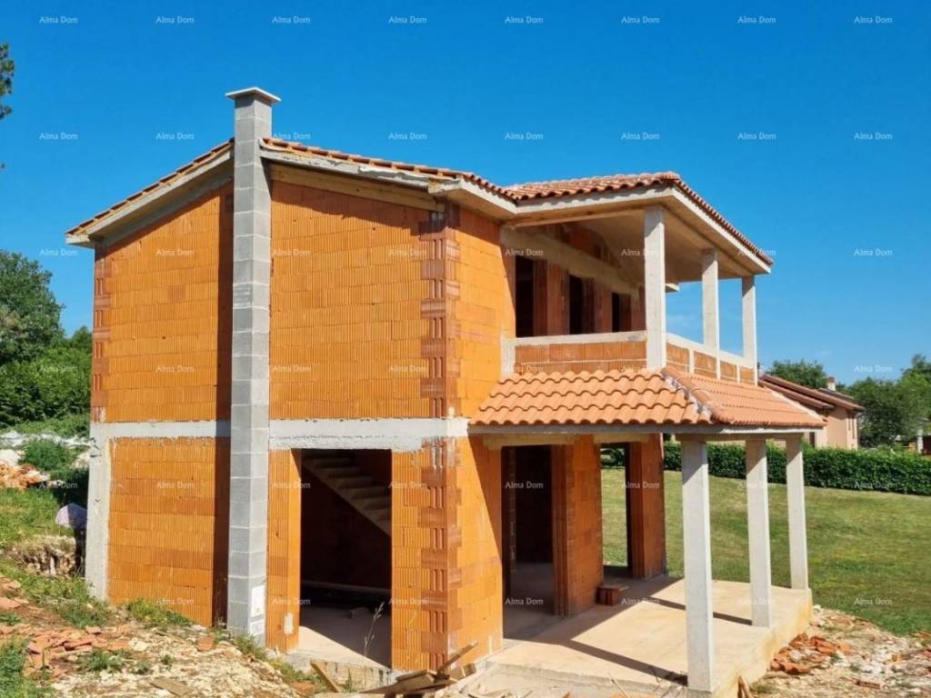 For sale a detached house in the Roh-Bau phase, Pazin area. For sale a roh-bau house with a swimming pool, gross area of 150 m, net area of 120 m, located on a plot of 911 m. The house is two-storey and consists of: Ground floor: Living room Kitchen Pantry Technical room Bathroom Covered terrace. First floor: Two bedrooms Two bathrooms Large terrace with a view. The house comes with a swimming pool and a smaller building that can be used as a storage room.