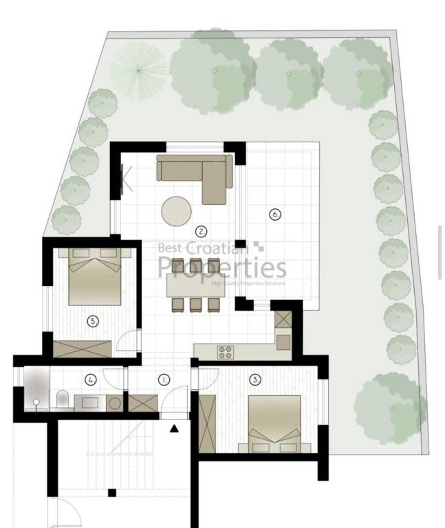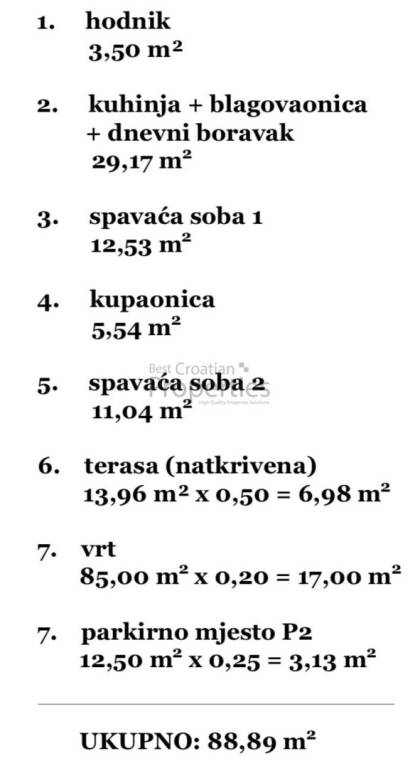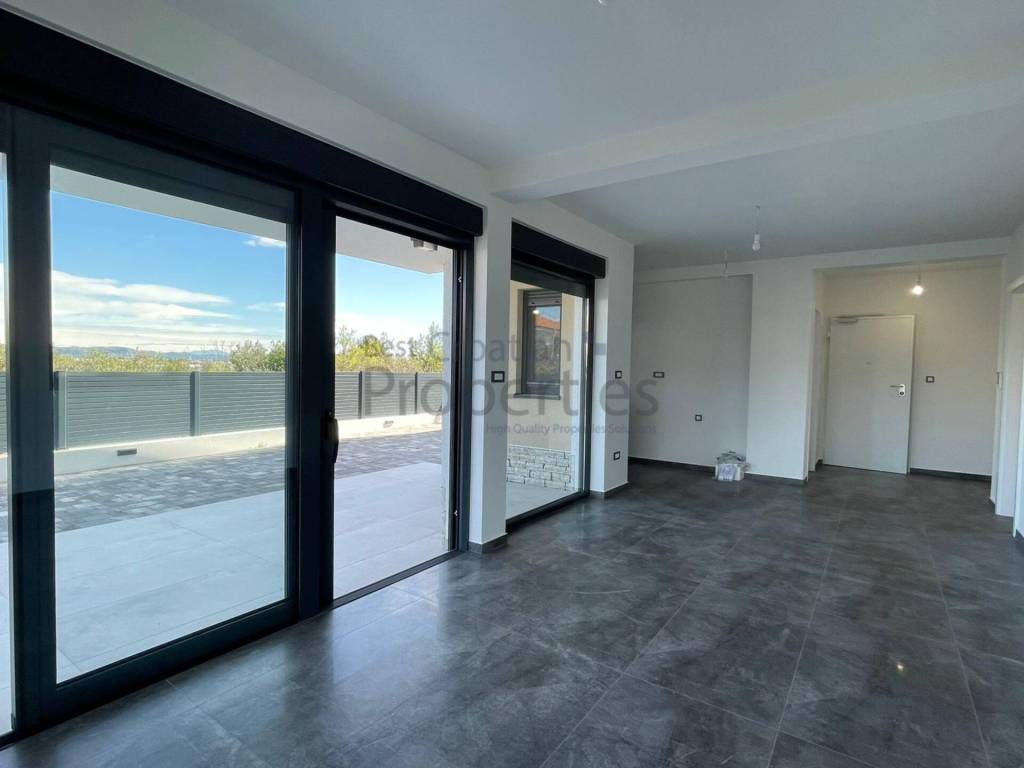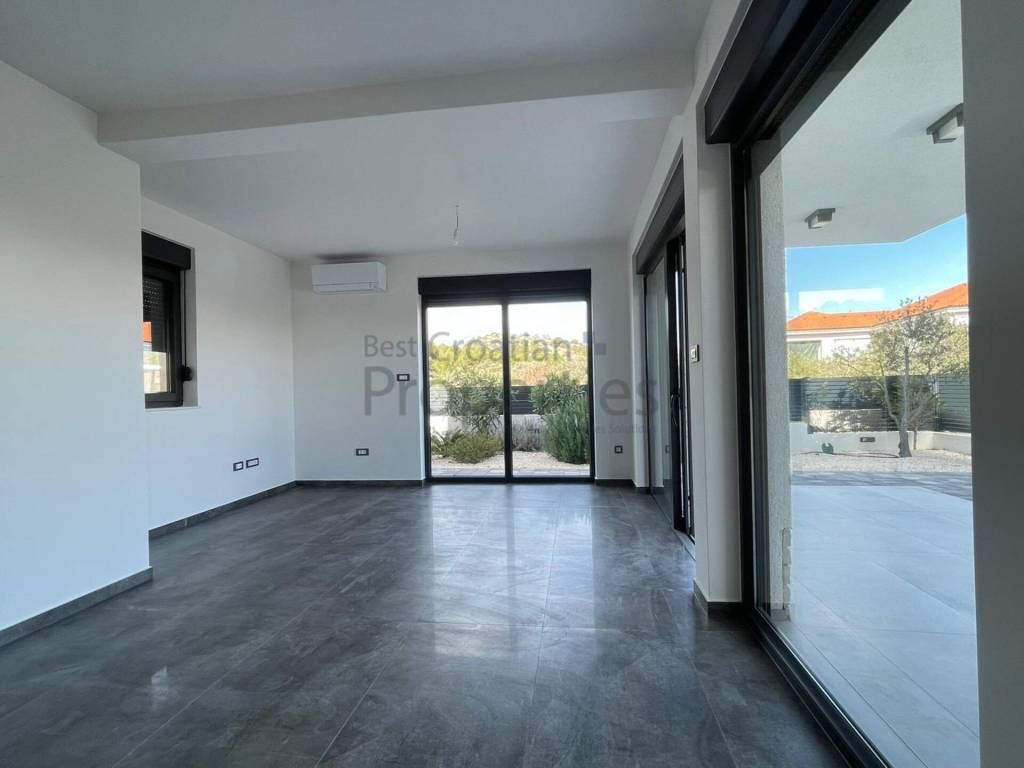 Tel.: 095/564 7500 (Tomislav) agent5@bestcroatianproperties.com PRODAVATELJ U SUSTAVU PDV-a. Kupac ne plaća ni porez na promet nekretnina! Uporabna dozvola izdana i stanovi etažirani Prodaje se prekrasan 3.sob. stan ukupne površine sa koeficijentima 91.40m2 na lijepoj lokaciji na Murteru. Radi se o stanu u prizemlju vrhunske armirano-betonske zgrade. Grijana zatvorena površina stana se sastoji od ulaznog hodnika (3,50m2), velikog dnevnog boravka sa kuhinjom i blagavaonicom (29.17m2), dvije spavaće sobe (12.53m2 i 11,04m2) i kupaonice (5,54m2). Sami stan ima 65m2 grijanog prostora te dodatno ima natkrivenu terase od 13,96m2 (po koeficijentu = 6.98m2), velikog vrta od 85.00 m2 (po koeficijentu = 17.00m2) te vanjskog parkirnog mjesta od 12,50m2 (po koeficijentu= 3.13m). UKUPNA PRODAJNA POVRŠINA SA KOEFICIJENTIMA IZNOSI 91,14m2. Ovaj moderni objekt visoke klase unutarnjeg uređenja izveden je s velikom pažnjom pri odabiru materijala i rasporeda stanova. Predivan i moderan izgled zgrade sa kamenom fasadom. Keramika najviše klase (talijanska keramika). Troslojna PVC stolarija (Marlex) + komarnici Električne rolete. Podno grijanje. Tri klime u stanu (svaka soba klimatizirana) Protuprovalna i protupožarna vrata. Videoportafon. Energetski certifikat A+.