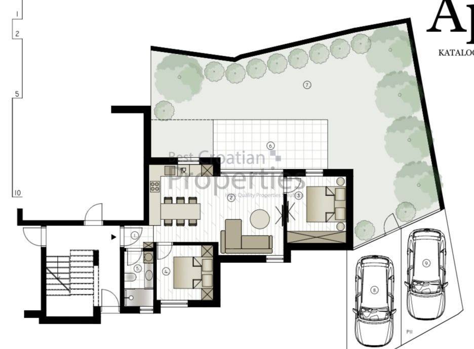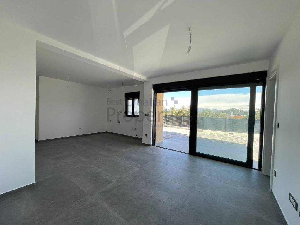 Tel.: 095/564 7500 (Tomislav) agent5@bestcroatianproperties.com PRODAVATELJ U SUSTAVU PDV-a. Kupac ne plaća ni porez na promet nekretnina! Uporabna dozvola izdana i stanovi etažirani Prodaje se prekrasan 3.sob. stan ukupne površine sa koeficijentima 79.51m2 na lijepoj lokaciji na Murteru. Radi se o stanu u prizemlju vrhunske armirano-betonske zgrade. Zgrada se sastoji od prizemlja, prvog i drugog kata sa ukupno 6 stambenih jedinica. Predmetni stan se sastoji od ulaznog hodnika (1.50m2), dnevnog boravka sa kuhinjom i blagavaonicom (26.98m2), dvije spavaće sobe (10.20m2 i 8.00m2) i kupaonice (4.14m2). Sami stan ima 50.82m2 grijanog prostora te natkrivene terase od 12.50m2 (po koeficijentu = 6.25m2), velikog dvorišta sa voćkama od 87.21m2 (po koeficijentu = 17.44m2) te DVA pripadajuća PARKIRNA MJESTA od 25m2 (po koeficijentu dva parkinga po 2.50m2) Ovaj moderni objekt visoke klase unutarnjeg uređenja izveden je s velikom pažnjom pri odabiru materijala i rasporeda stanova. Predivan i moderan izgled zgrade sa kamenom fasadom. Keramika najviše klase (talijanska keramika). Troslojna PVC stolarija (Marlex). Komarnici na prozorima. Električne rolete. Podno grijanje. Tri klime u stanu (svaka soba klimatizirana) Protuprovalna i protupožarna vrata. Videoportafon. Energetski certifikat A+.