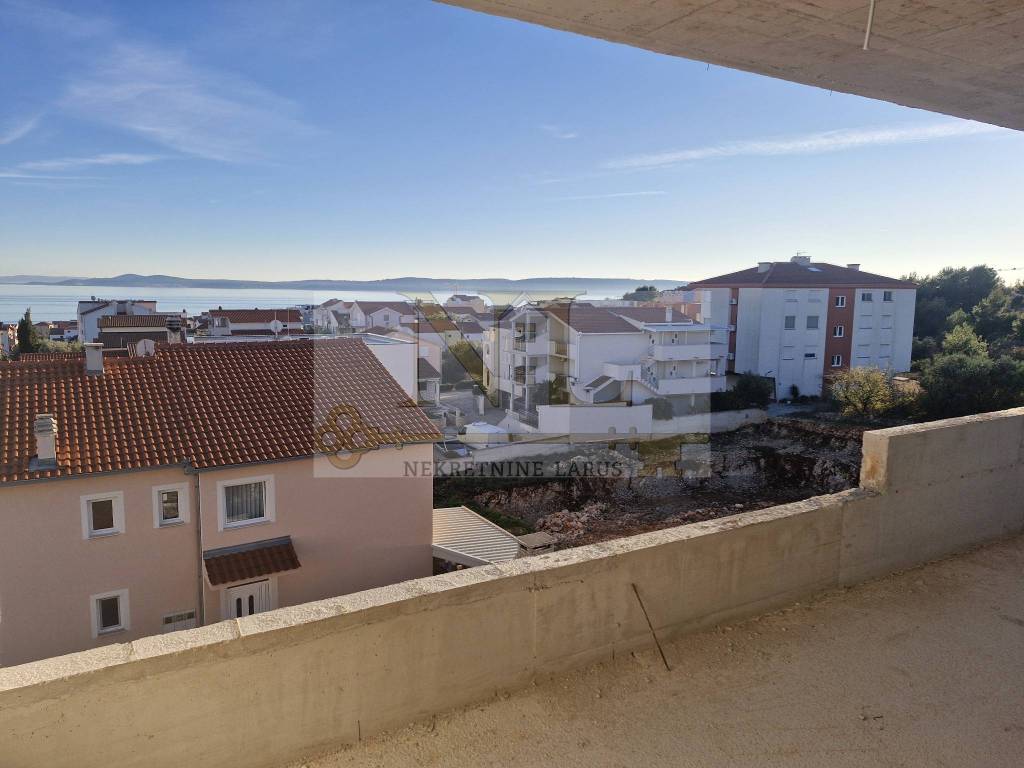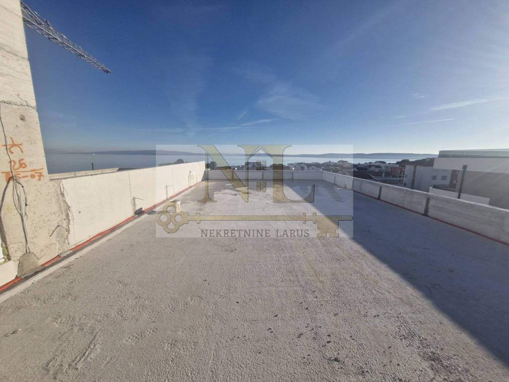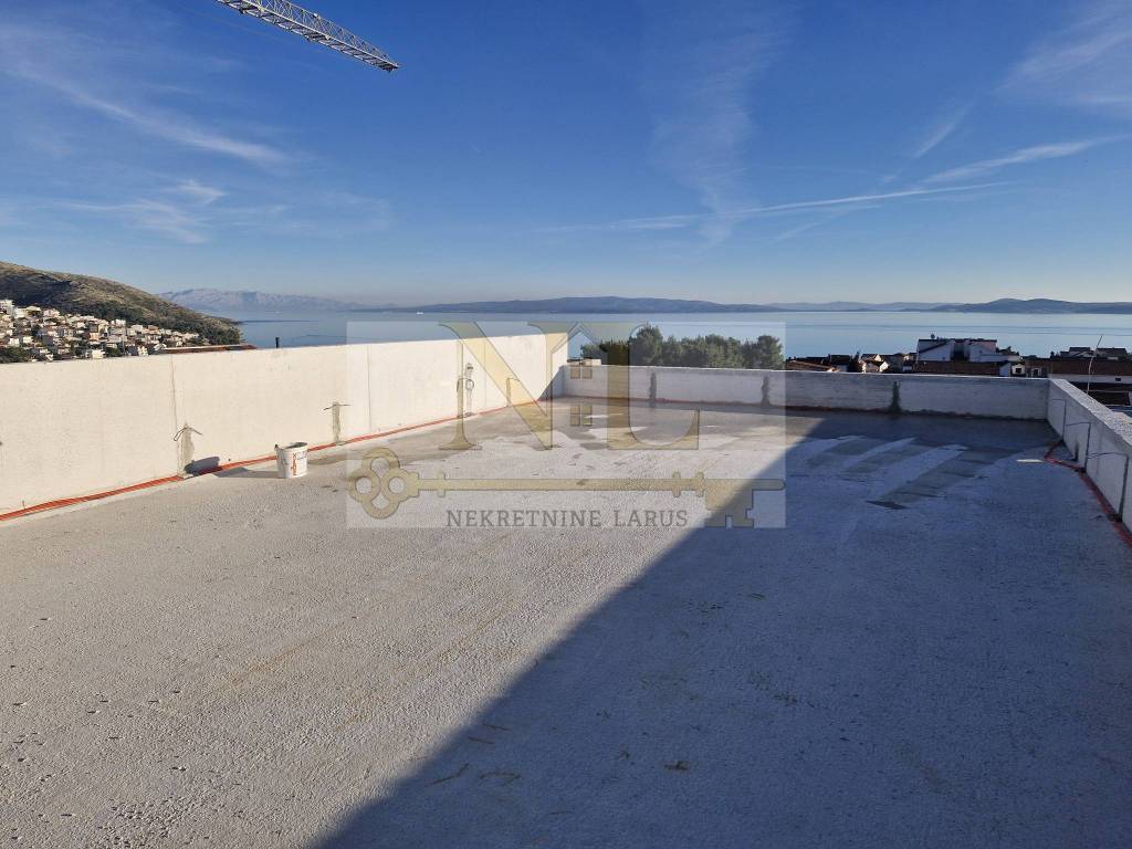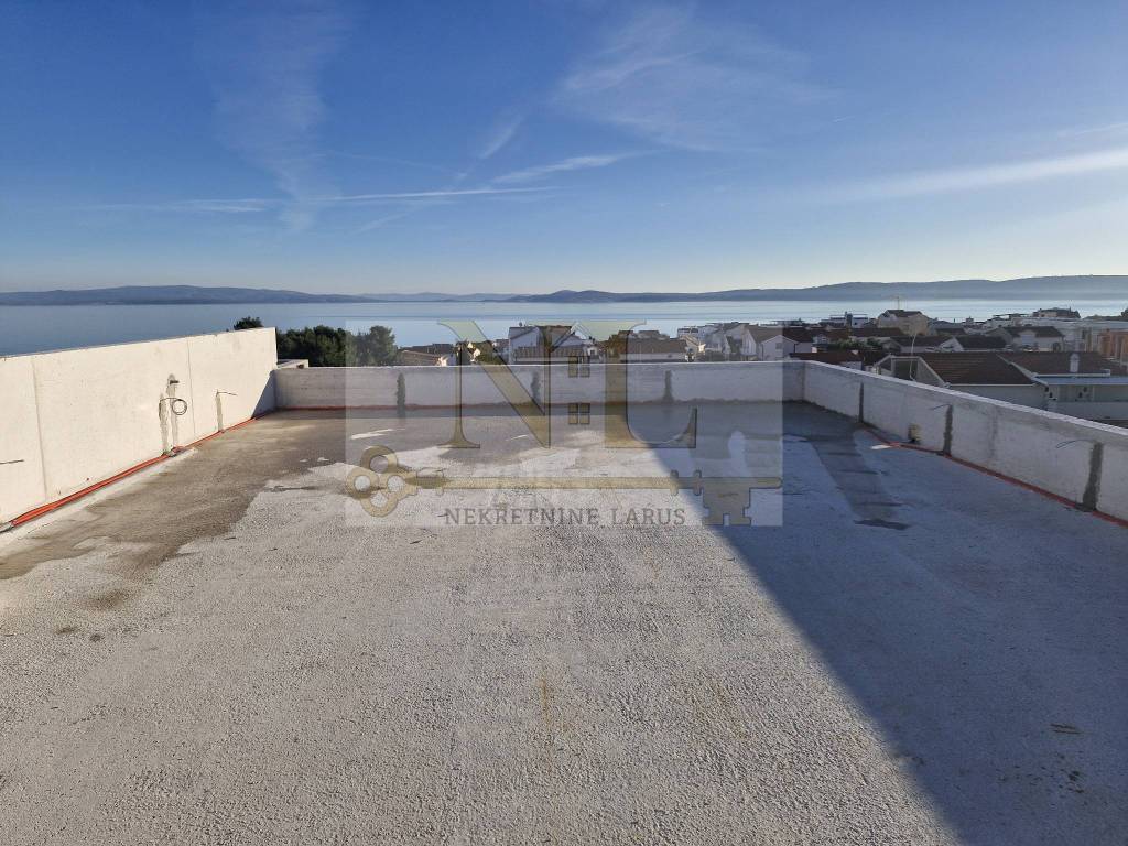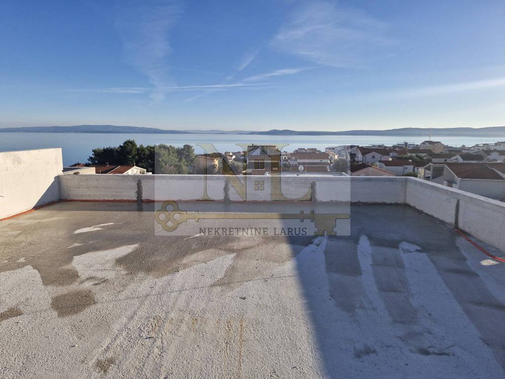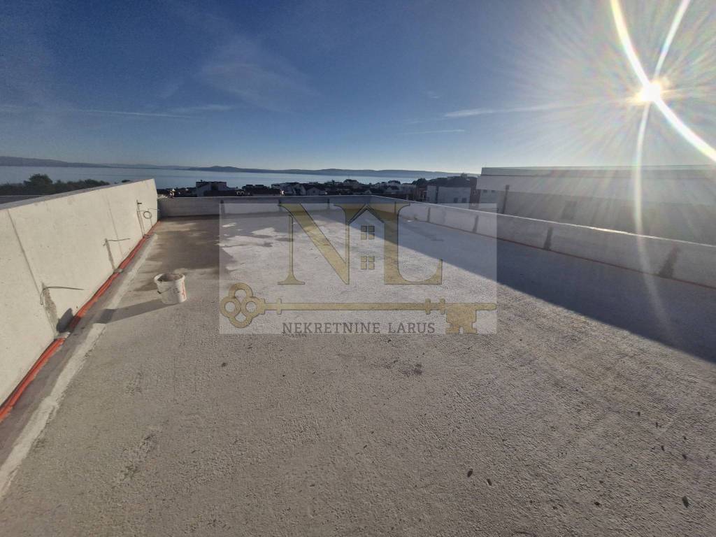 We are selling a penthouse apartment S7 with a roof terrace on the third floor of a new modern building, Okrug Gornji, island Čiovo. The building is located in a central location in Okrug Gornji with excellent access and a beautiful view of the sea, and all apartments have spacious south-facing balconies. The building is located 500 meters from the sea and the beach. The building has 8 apartments and 13 outdoor parking spaces, and has an elevator and a large communal pool. Penthouse apartment S7 with a roof terrace is located on the third floor of the building and consists of three bedrooms, two bathrooms, a storage room, a living room with a kitchen and a large terrace and a roof terrace with a panoramic view of the nearby archipelago. The apartment has two outdoor parking spaces. Surfaces: Interior area of the apartment: 83.4 m2 Terrace: 24 m2 Roof terrace: 109.6 m2 Total floor area: 217 m2