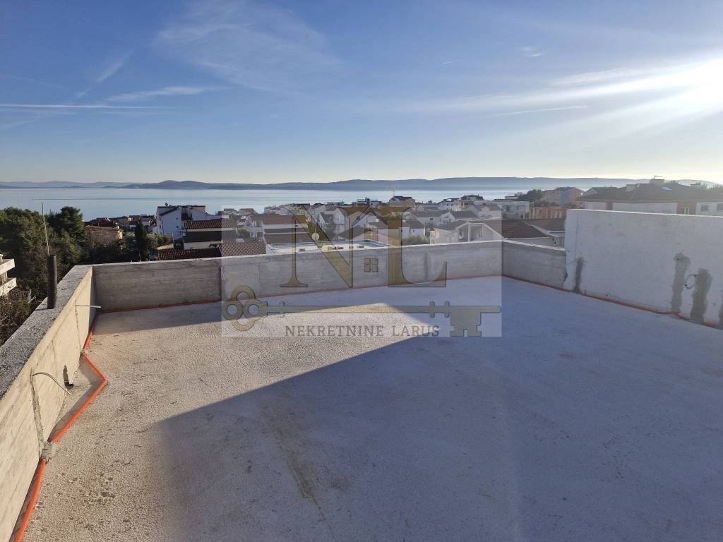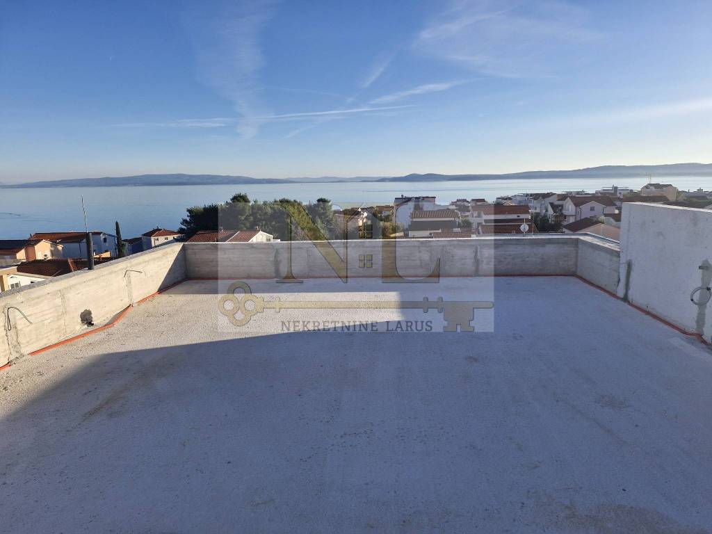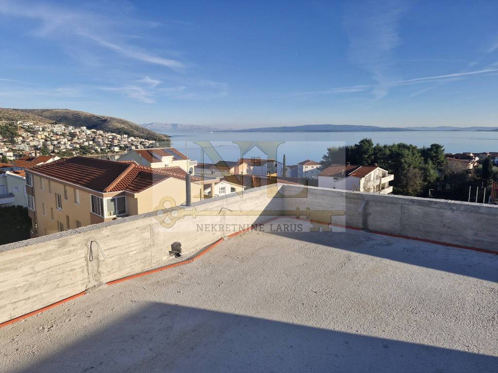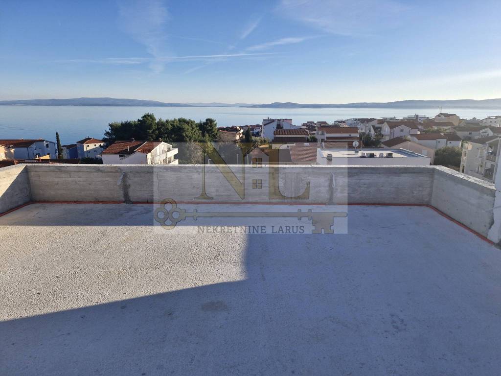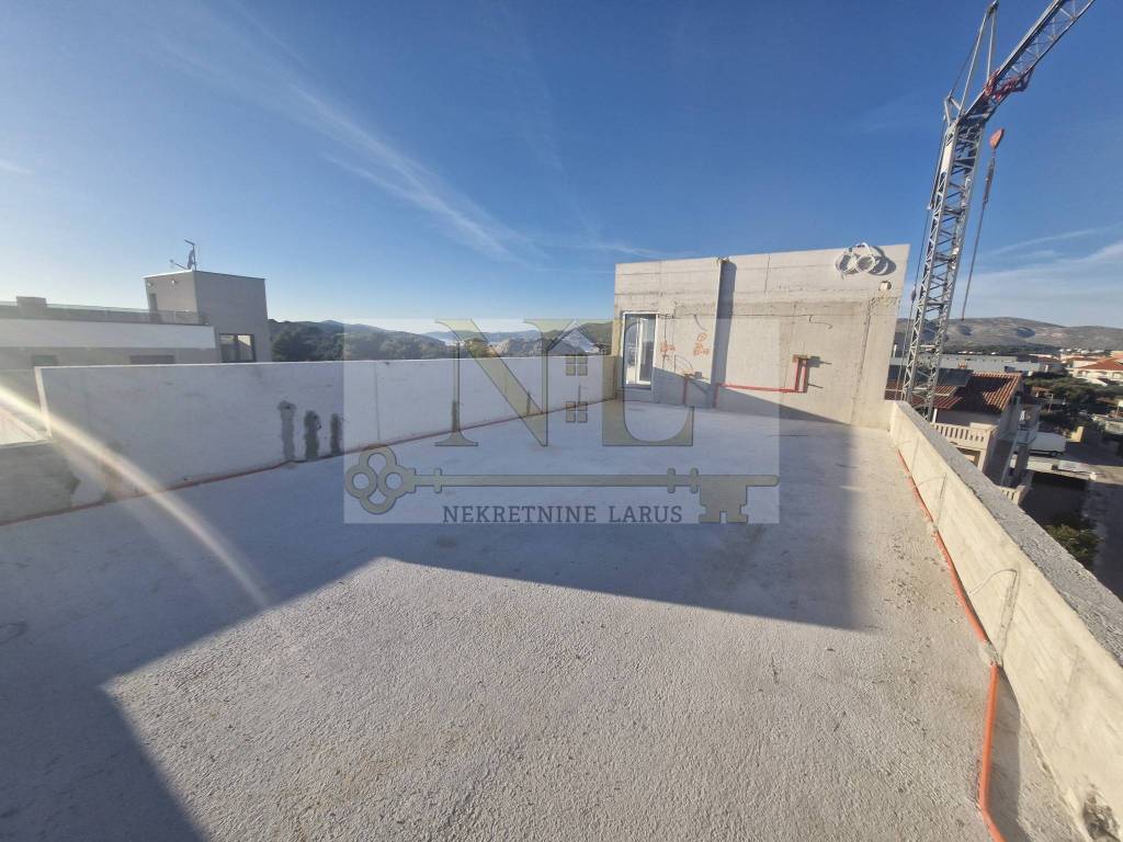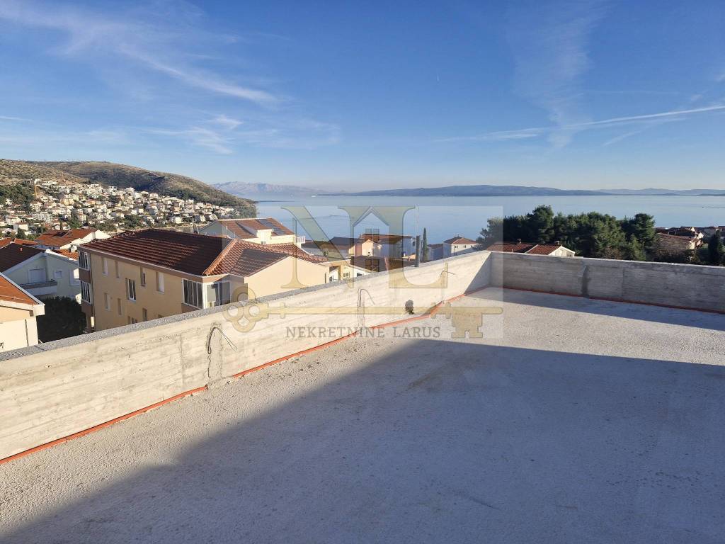 The building is located in a central location in Okrug Gornji with excellent access and a beautiful view of the sea, and all apartments have spacious south-facing balconies. The building is located 500 meters from the sea and the beach. The building has 8 apartments and 13 outdoor parking spaces, and has an elevator and a large communal pool. Penthouse apartment S8 with a roof terrace is located on the third floor of the building and consists of two bedrooms, two bathrooms, a living room with a kitchen and a terrace and a large roof terrace with a panoramic view of the sea and nearby islands. The apartment has two outdoor parking spaces. Surfaces: Interior area of the apartment: 55.46 m2 Terrace: 14.63 m2 Roof terrace: 70.40 m2 Total floor area: 140.49 m2