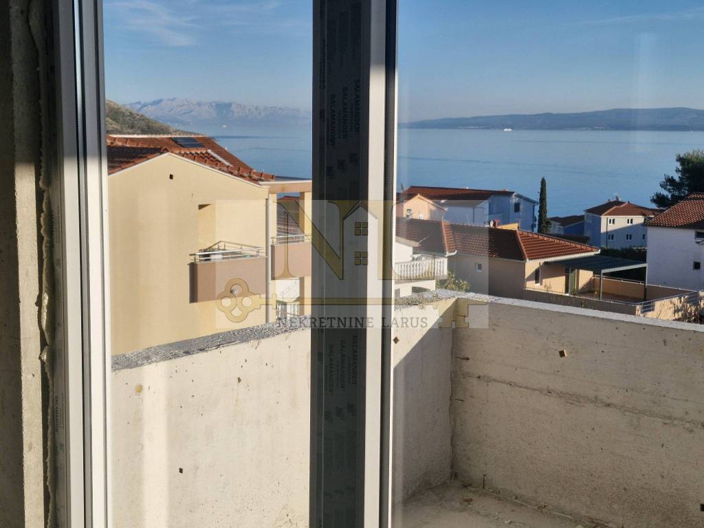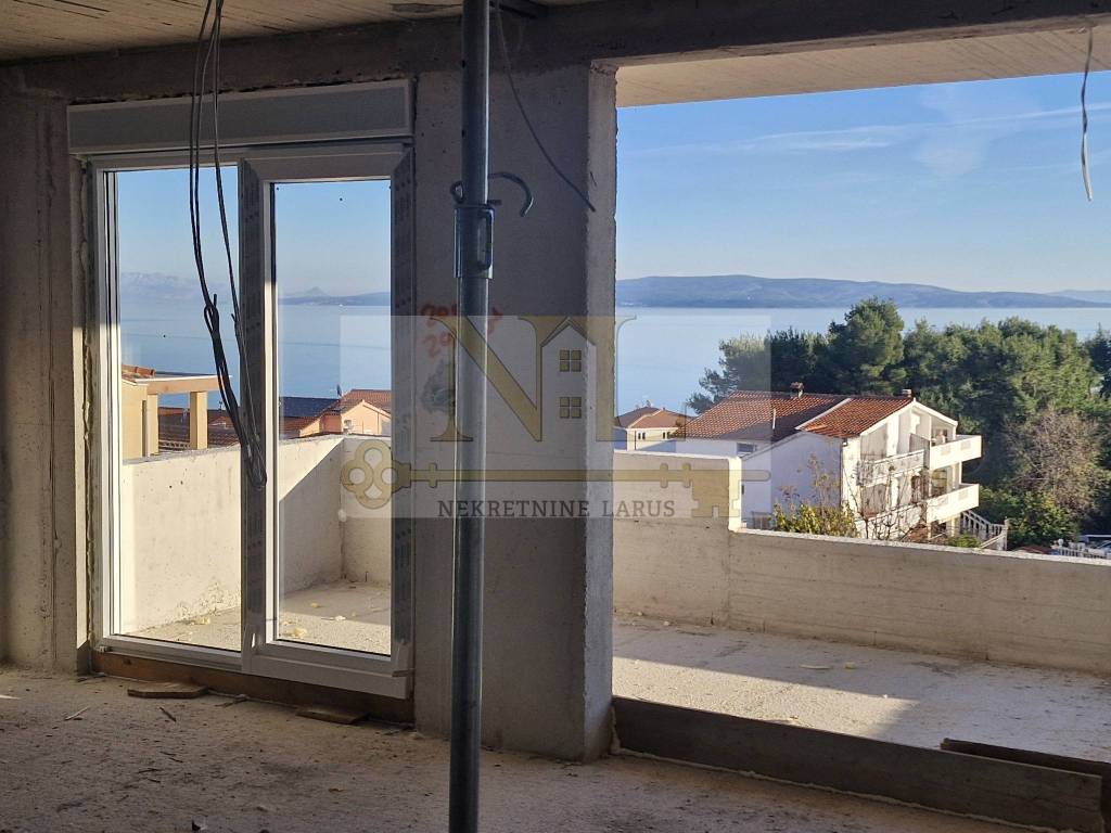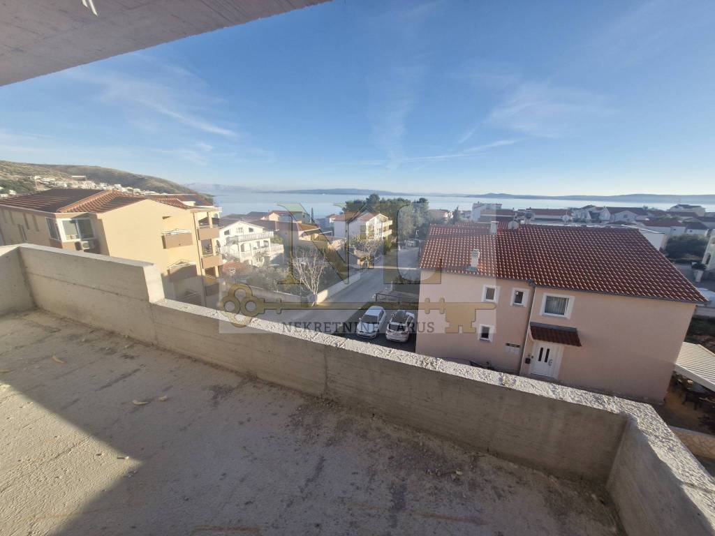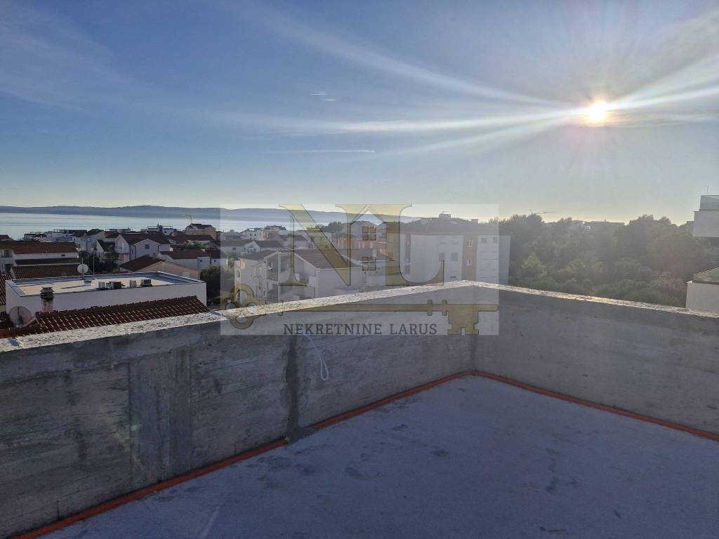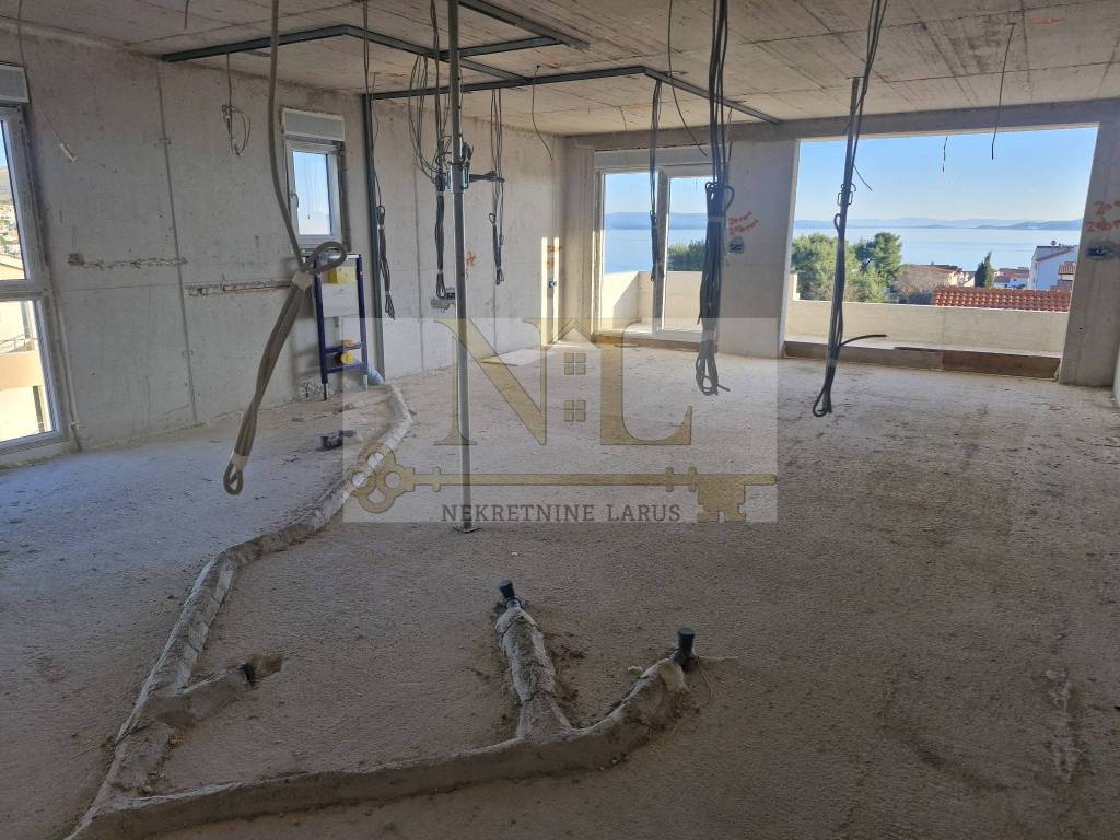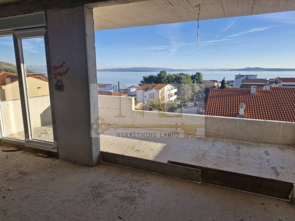 The building is located in a central location in Okrug Gornji with excellent access and a beautiful view of the sea, and all apartments have spacious south-facing balconies. The building is located 500 meters from the sea and the beach. The building has 8 apartments and 13 outdoor parking spaces, and has an elevator and a large communal pool. Penthouse apartment S8 with a roof terrace is located on the third floor of the building and consists of two bedrooms, two bathrooms, a living room with a kitchen and a terrace and a large roof terrace with a panoramic view of the sea and nearby islands. The apartment has two outdoor parking spaces. Surfaces: Interior area of the apartment: 55.46 m2 Terrace: 14.63 m2 Roof terrace: 70.40 m2 Total floor area: 140.49 m2