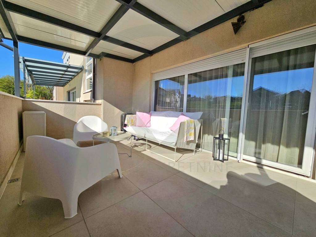 Iz dnevnog boravka se izlazi na veliku natkrivenu terasu sa pogledom na zelenilo. U stanu je zajamčena privatnost bez susjednih pogleda.