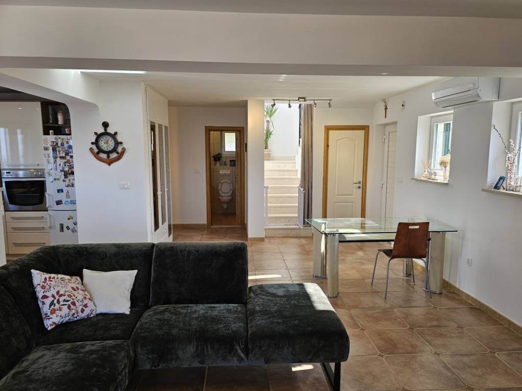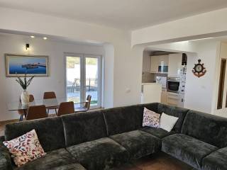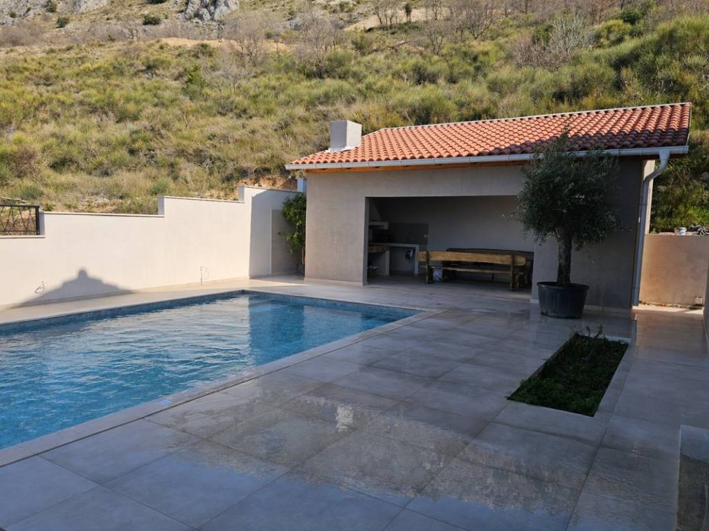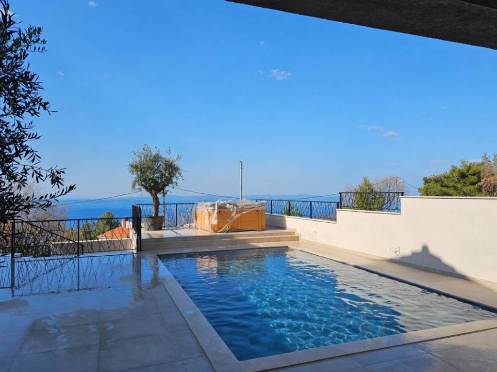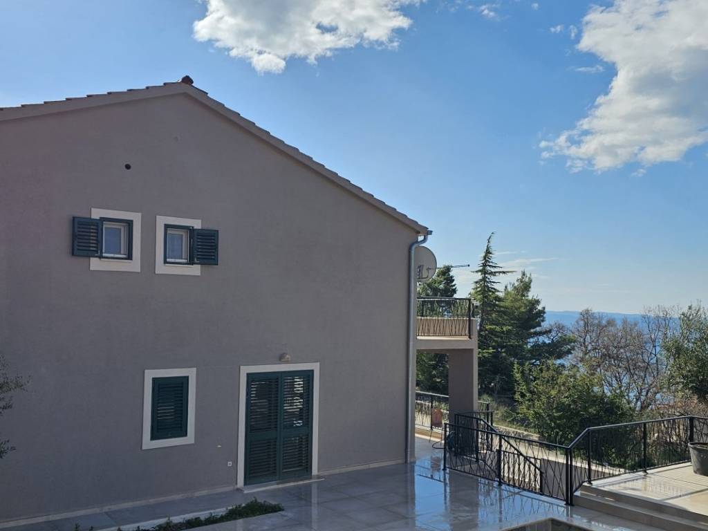 Situated in a beautiful location above Podstrana, a detached house with a pool and sea view is for sale. It is located on a plot of 430m2 and occupies a total living area of about 200m2, spread over two floors.