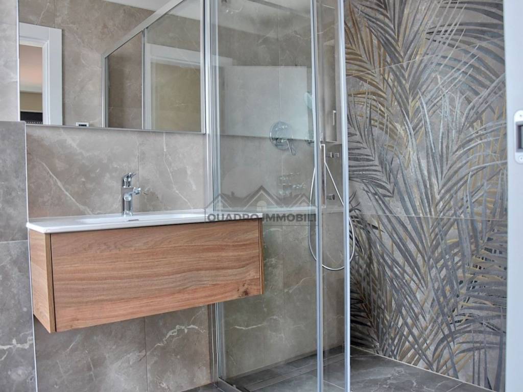 Built-in elevator for 6 people brand Khone. In all rooms (except the bathroom) there is a 15 mm thick oak parquet on the floor. The exterior joinery is made of aluminum Sucho profile 75 S with three-layer glass filled with argon and with electric blinds. The room doors are white and made to measure with 9cm wide moldings. These same skirting boards are installed in the same way as the plinth where the parquet is installed. Bathrooms are equipped with wardrobes and built-in sinks, mirrors with LED lighting, showers with shower channels and shower cabins, and Hans Grohe faucets. High quality Italian ceramic tiles of large dimensions