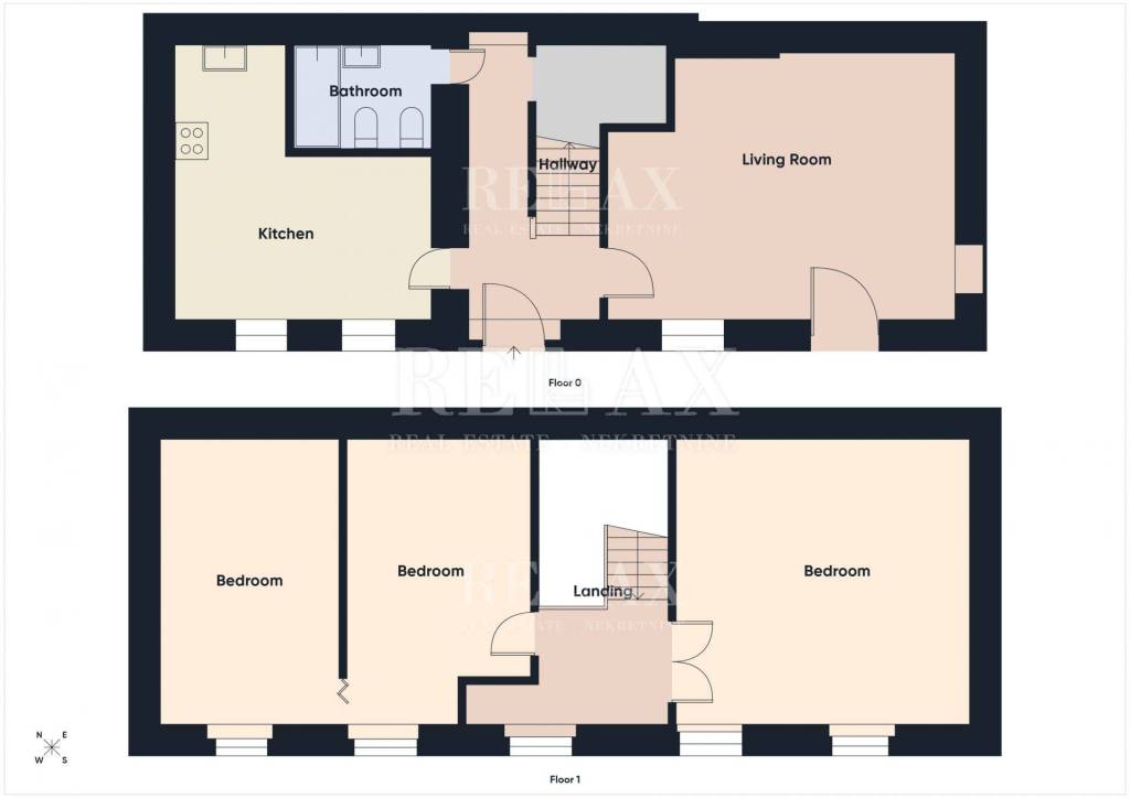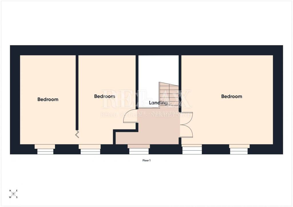 The house features a typical coastal layout. The ground floor includes a kitchen, a spacious living room with access to a terrace, and a bathroom. Internal stairs run through the center of the house and lead to the first floor, where there are three bedrooms – one large and two smaller ones.