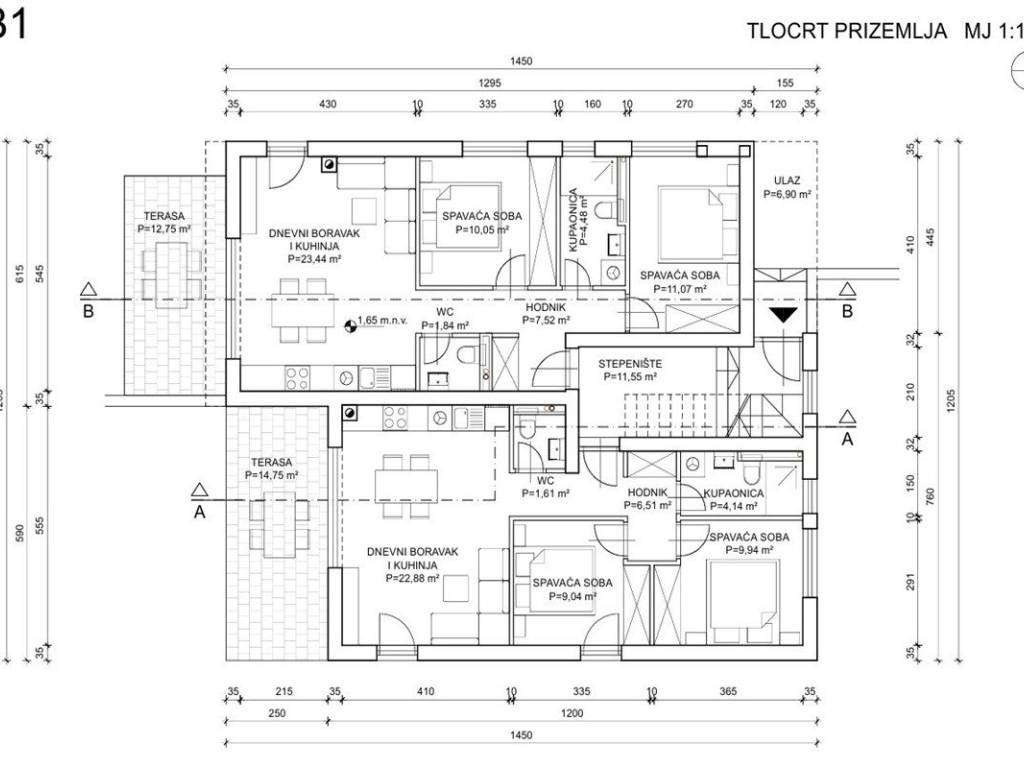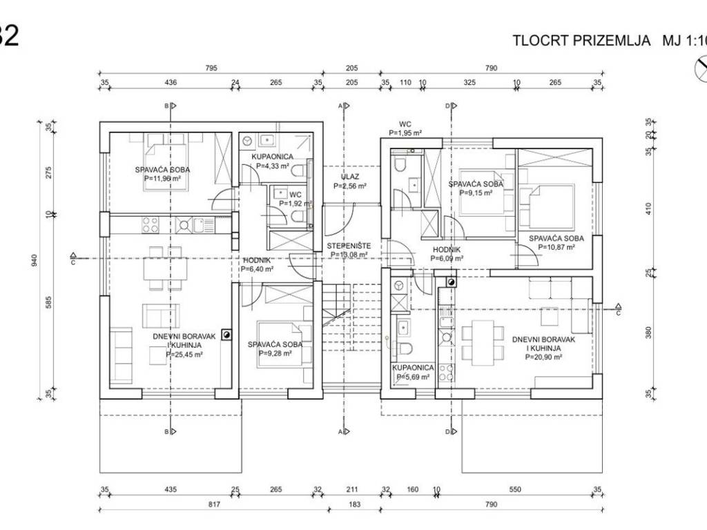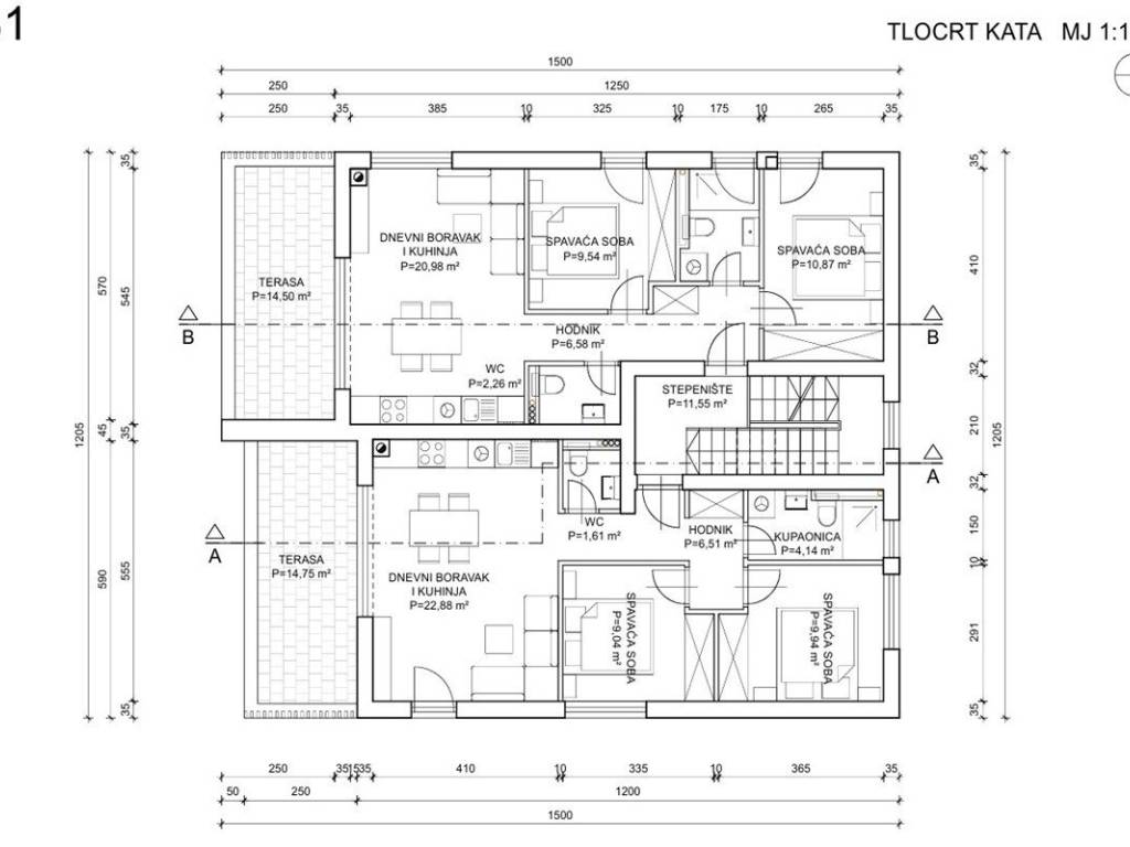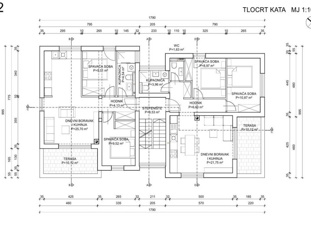 The project consists of two residential buildings, with each building having 6 apartments two on the ground floor, two on the first floor and two on the second floor. All apartments have two bedrooms and a functional layout, and consist of an entrance hall, living room with kitchen and dining room, two bedrooms, bathroom, additional toilet and terrace.