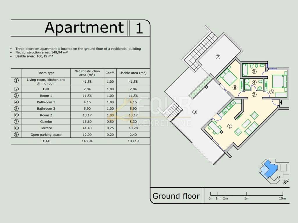 The living room and one bedroom have direct access to the 41.43m2 terrace with a 16.60m2 gazebo.