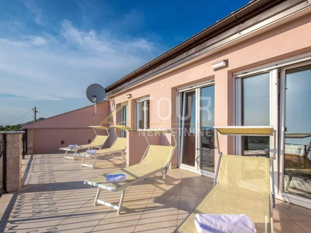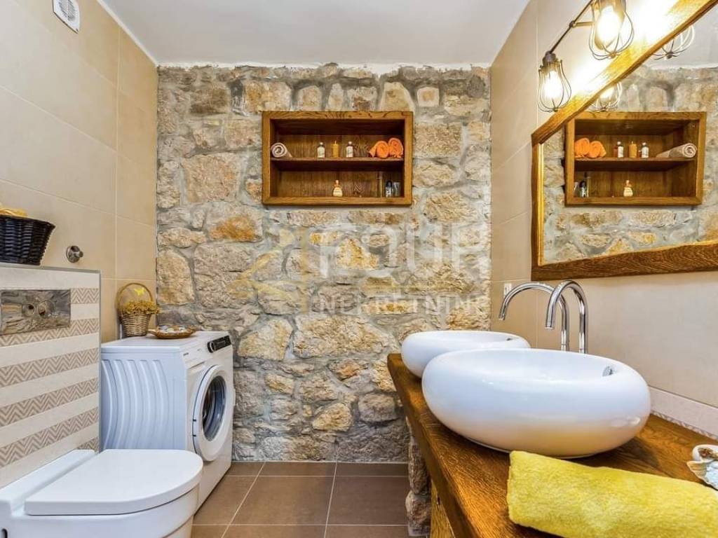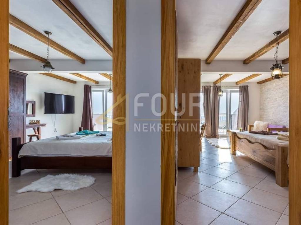We offer a detached house with a swimming pool, a garden of 442 m2 and a beautiful view of the sea, the islands and Velebit. The house is of recent construction, with a total area of 213.23m2. On the ground floor there is a living room with a fireplace, a kitchen with a dining room, a sauna and a 15.8m2 terrace with a barbecue and an outdoor shower. On the first floor there are two bedrooms with private bathrooms and terraces (2x 15.9m2). The house is very nicely decorated with rustic style details that give extra warmth to this coastal house. In the garden there is also an auxiliary building that is used as a laundry room, but there is a possibility of arranging it into another additional residential unit. Covered parking for two cars is also available. Great property for tourist rental!