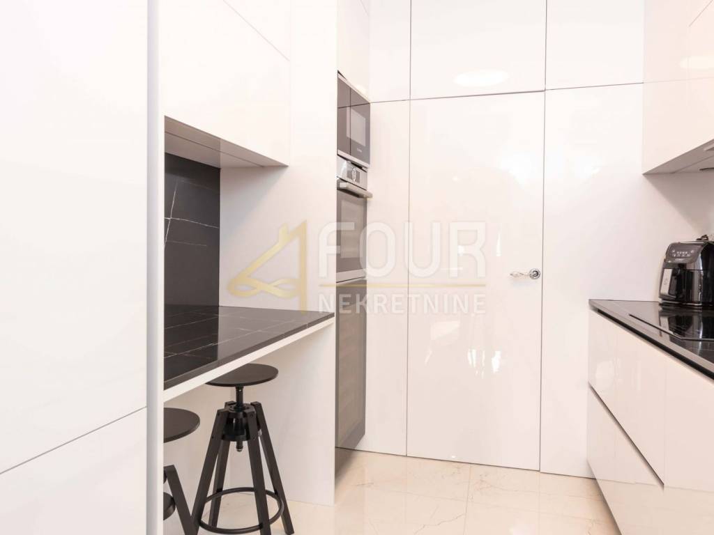 The apartment has a luxurious 147m2 area, a 3-bedroom + living room layout, and has a large living room, a separate kitchen with a pantry, two luxuriously renovated bathrooms, one of which is en-suite, and two balconies, one of which is 20 m2 with a panoramic view. The hallways and rooms are equipped with built-in wardrobes, and underfloor heating extends across all ceramic surfaces. Each room is equipped with a Mitsubishi air conditioner.