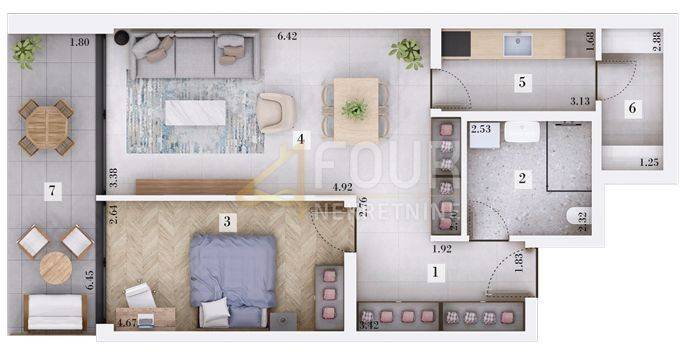 This apartment offers the perfect combination of comfort and practicality, with a spacious living room connected to the kitchen and dining room in an open space concept, a hallway, a separate bedroom, and a modern bathroom.