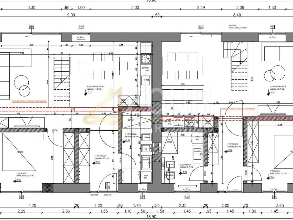 There is a conceptual project for a ground floor of 130.90 m2 with a tavern of 50 m2, or alternatively for two two-story apartments (ground floor and basement) with a total area of ​​199.15 m2.