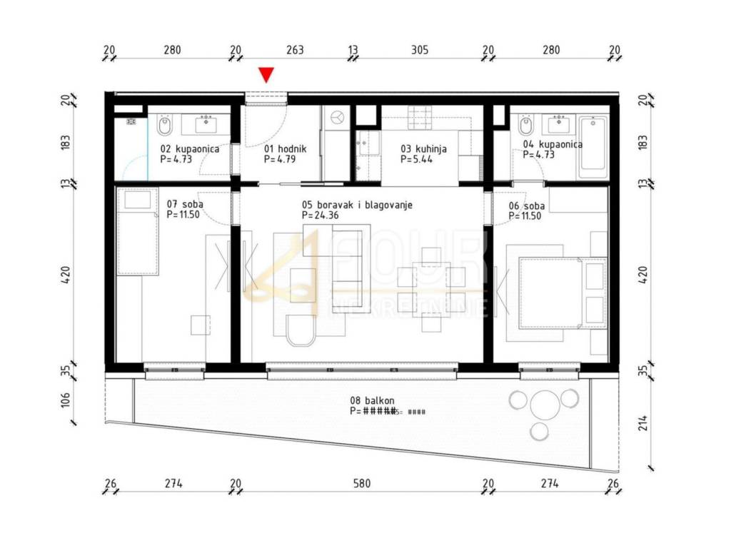 The apartment with an area of ​​76.94m2 consists of two bedrooms, an open living room with a modern kitchen, two bathrooms and a balcony overlooking the surrounding nature. The apartment comes with a storage room and a garage parking space, which further contributes to comfort and practicality.