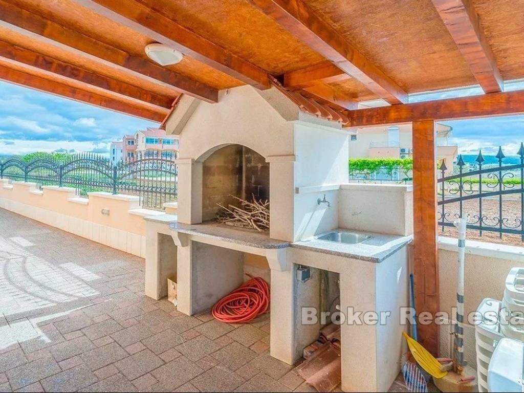 We are selling a house in an attractive location, first row to the sea near Zadar.   This is a property that meets several criteria. Whether you want to invest in tourism, have your own new place of residence or your own temporary summer oasis to enjoy the crystal clear sea.   The house is located on a spacious plot with direct access to the beach. There are 6 covered parking spaces, a barbecue area and a sunbathing area. If desired, it is possible to build a swimming pool to complete the whole story regarding its usability and functionality.   The house itself is spread over three floors:   – On the ground floor there is a two-story master apartment that has direct communication with the southern terrace and the front part of the yard. The apartment consists of an open-concept living room with a kitchen and dining room, two bedrooms, a bathroom and an internal staircase leading to its upper floor where there is another room, an additional kitchen and dining room, a bathroom and a terrace with an open view of the sea.   – On the first floor there are two one-bedroom apartments with separate entrances, each with its own terrace and open view of the sea and the entire archipelago.   – On the second floor there are also 3 additional apartments. 3 one-bedroom apartments with their own rooms, living areas, terraces and bathrooms.   Excellent micro and macro location of the property. Fast communication with the city of Zadar, the airport and the highway. As well as the proximity of all amenities necessary for life (shops, pharmacies, top restaurants, bars…). In case you have your own boat, the largest Marina on the Adriatic is only a 10-minute drive away.