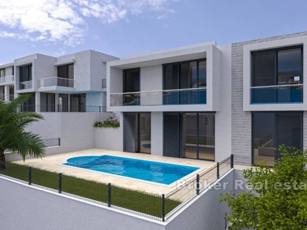 Villa K5 is located in a quiet location with a beautiful panoramic view of the Rogoznica aquatorium, just a minute’s walk from the sea and facing west. It is located within a prestigious complex of five designed buildings. With a land area of 427 m², the villa extends over two floors, the ground floor and the first. The ground floor is designed as a gallery with a height of 6m and is designed for an open concept living room, kitchen and dining room, with the possibility of a fourth bedroom. On the first floor there are three bedrooms with bathrooms and exits to the balcony. Large sliding glass walls allow plenty of natural light and open the space to the outside of the garden. The 20m2 technical room is located on the ground floor of the property, right next to the 3 parking spaces that are provided for this beautiful villa. The landscaped garden is a real oasis for enjoying the outdoors with a 35m2 swimming pool and terrace. The villa was built with carefully selected high-quality materials, and the finishing equipment follows modern luxury standards. This property is not only a great opportunity for a tourist rental investment, but also an ideal solution for those looking for a permanent home in one of the most desirable locations. The distance of only 25 km from Split Airport and only 35 km from the center of Split makes everyday stay even easier.
