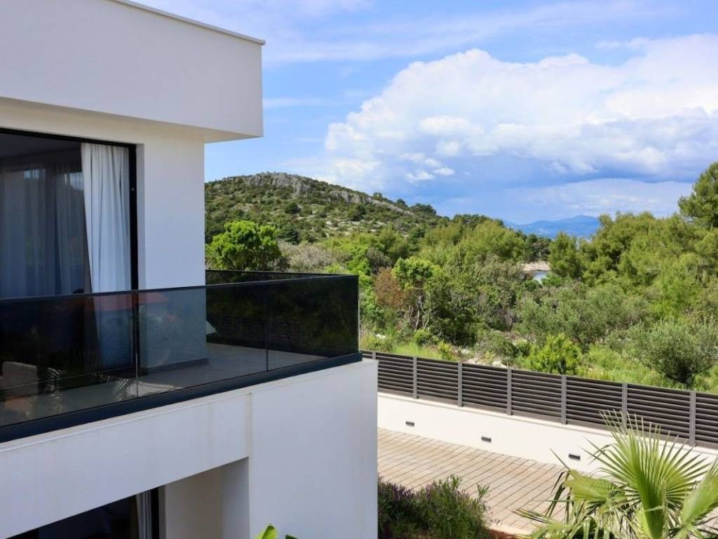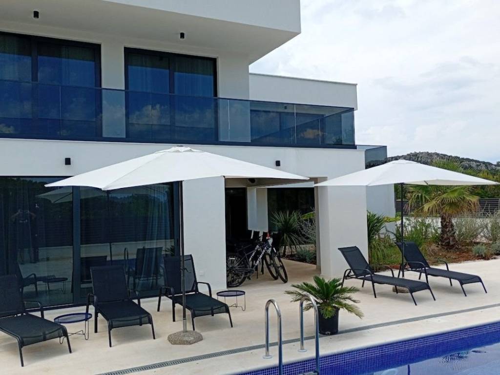 Newly built villa located in a quiet area, just a few steps from the sea. It spans two floors. The ground floor features a spacious bedroom with an en-suite bathroom, a guest toilet, a storage room, a modern kitchen that connects to the dining area, and a living room. The upper floor includes three comfortable bedrooms, each with its own bathroom and access to a balcony with sea views. In the landscaped yard, there is a swimming pool with a sunbathing area and two ancillary buildings: a storage room of 19.44 m² and a wellness area of 32.16 m² equipped with a shower, sauna, and gym. The villa is equipped with a 10 kW solar power system, and it is also connected to public electricity and water. Instead of city sewage, it uses a septic tank. Heating and cooling are provided by six air conditioning units, while the wellness area has separate climate control. The entire property is meticulously landscaped, with an irrigation system that maintains a lush garden featuring over 100 plants, including tropical palms and bananas, as well as Mediterranean plants like lemons, cypress, oleander, and lavender. The outdoor space with a grill and dining area is perfect for summer gatherings, and the speakers installed outdoors create a perfect atmosphere. The security of the property is ensured by video surveillance with four cameras and an alarm system with motion, smoke, and water sensors. The villa is fully equipped to meet the standards for a 4-star classification, making it ideal for both personal enjoyment and tourist rentals. The entire property is enclosed by a stone wall and galvanized fence, with parking spaces for four cars. This property represents the perfect blend of luxury, comfort, and proximity to nature, ideal for anyone seeking a peaceful retreat by the sea.