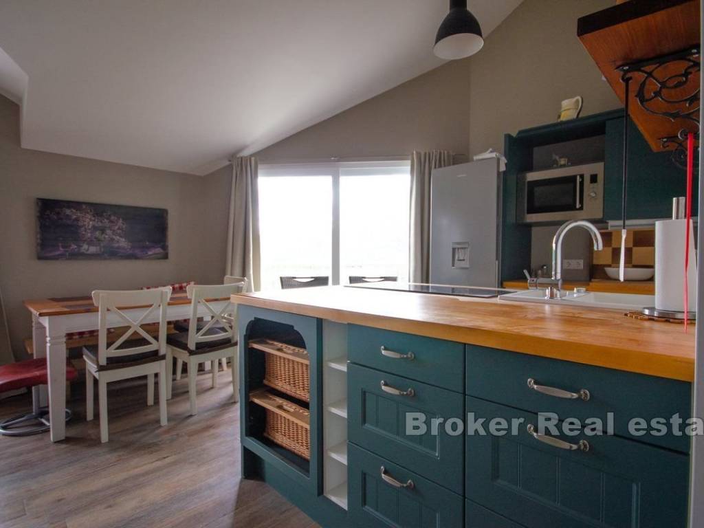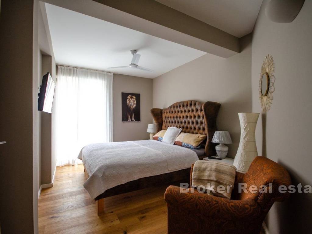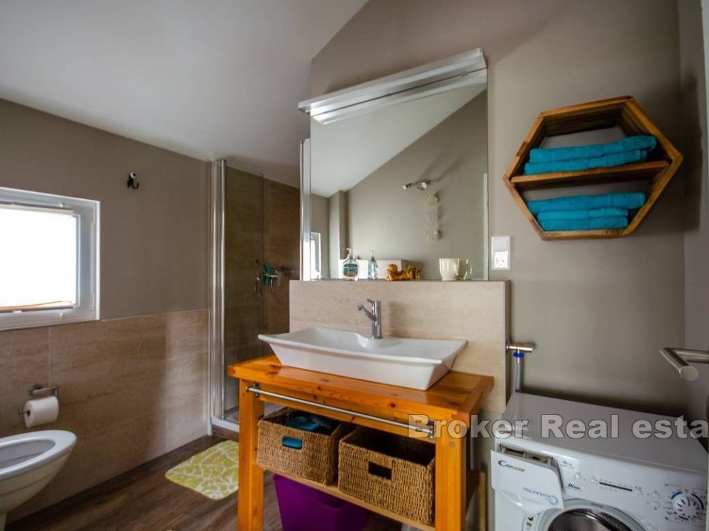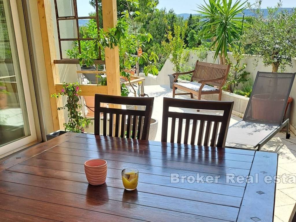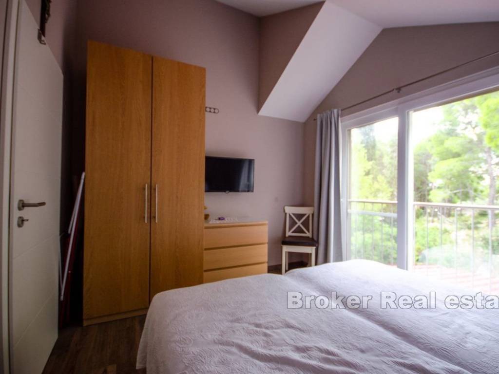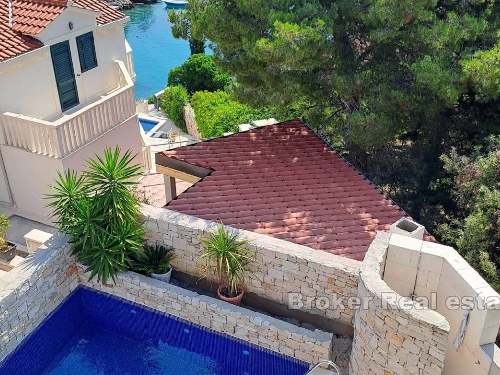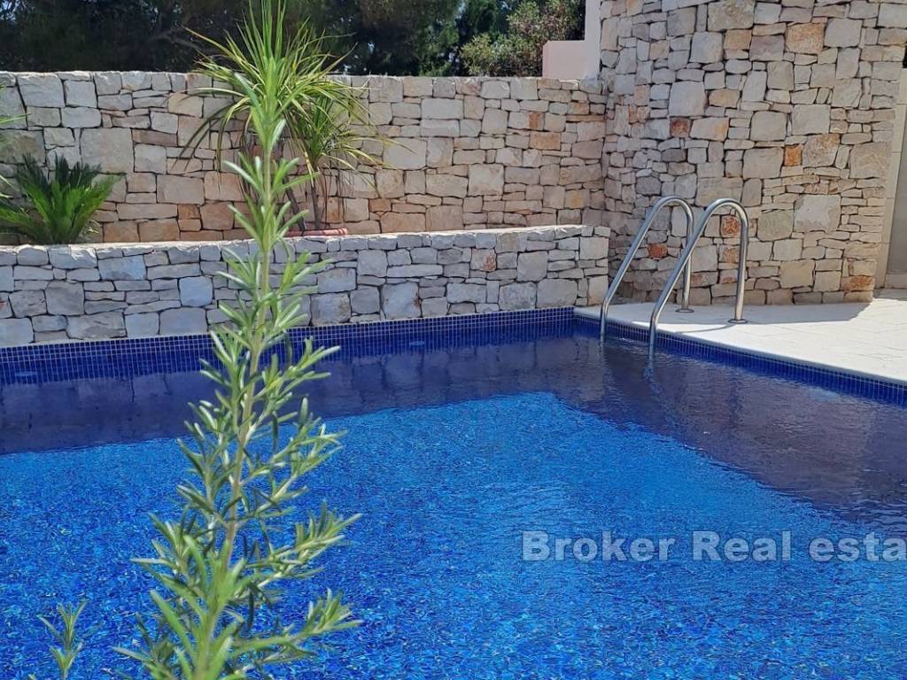 For sale is a villa with a sea view in one of the most attractive and beautiful coves on the island of Brac. The bay is located on the south side of the island, 5 minutes from the center of Milna, where there are all the necessary facilities for a pleasant life, such as restaurants, shops, cafes, bus line to Supetar. The villa consists of 3 floors, carefully designed and built from high-quality materials. There are 3 bedrooms on the ground floor, one of which has its own bathroom, while the other two rooms have access to a shared bathroom that has an entrance from the hallway. Also, on that floor there is also a room that serves as a storage room. From this floor there is access to a spacious terrace with a heated swimming pool. On the upper or middle floor there is a kitchen, a dining room and a spacious living room with access to a balcony with a view of the sea and the bay. Part of that terrace is covered and has an outdoor dining table. These two floors function as one unit, while the last floor functions as a one-room apartment with its own kitchen, living room and dining room, and also has a terrace with a view of the sea. The villa was built about 10 years ago, very well preserved and maintained, and is being sold fully furnished.