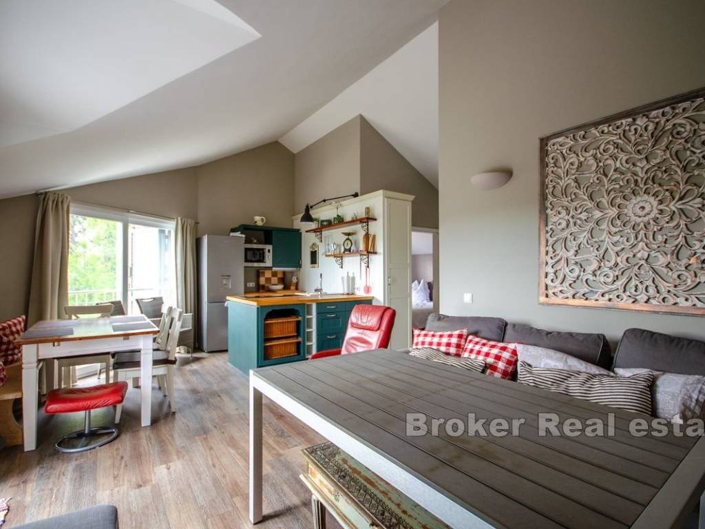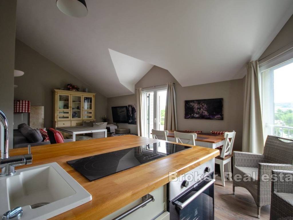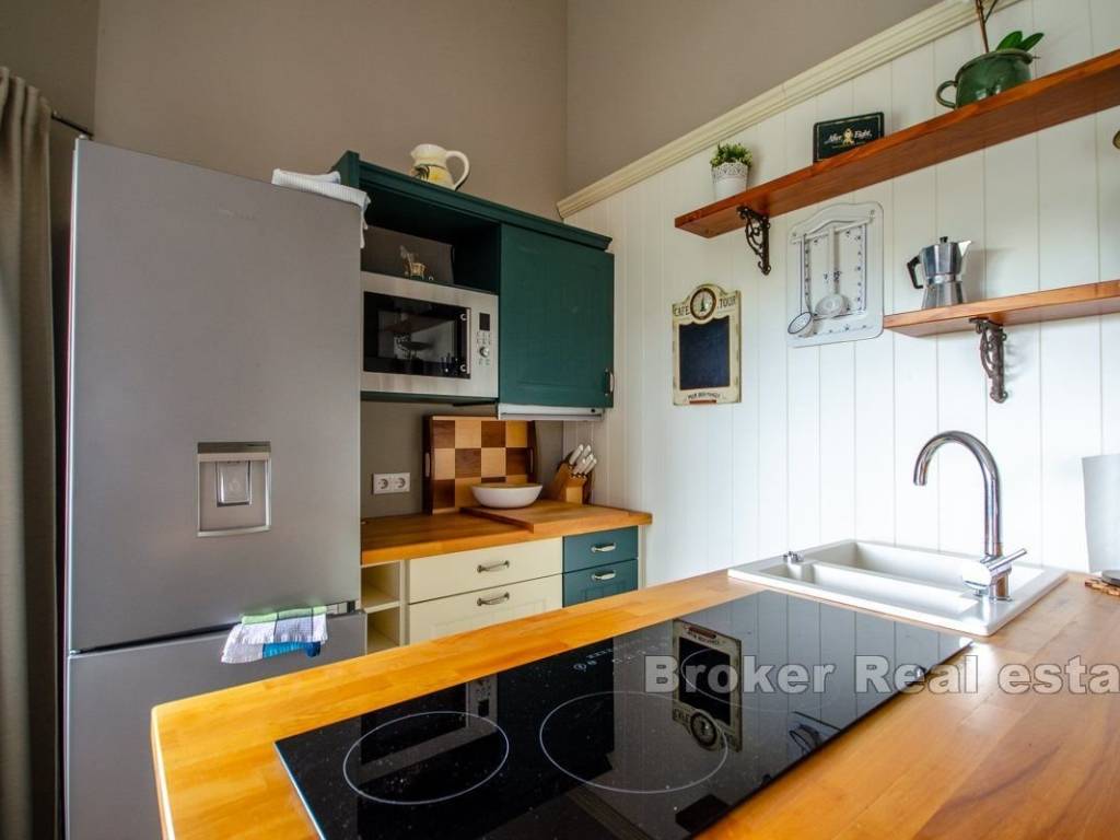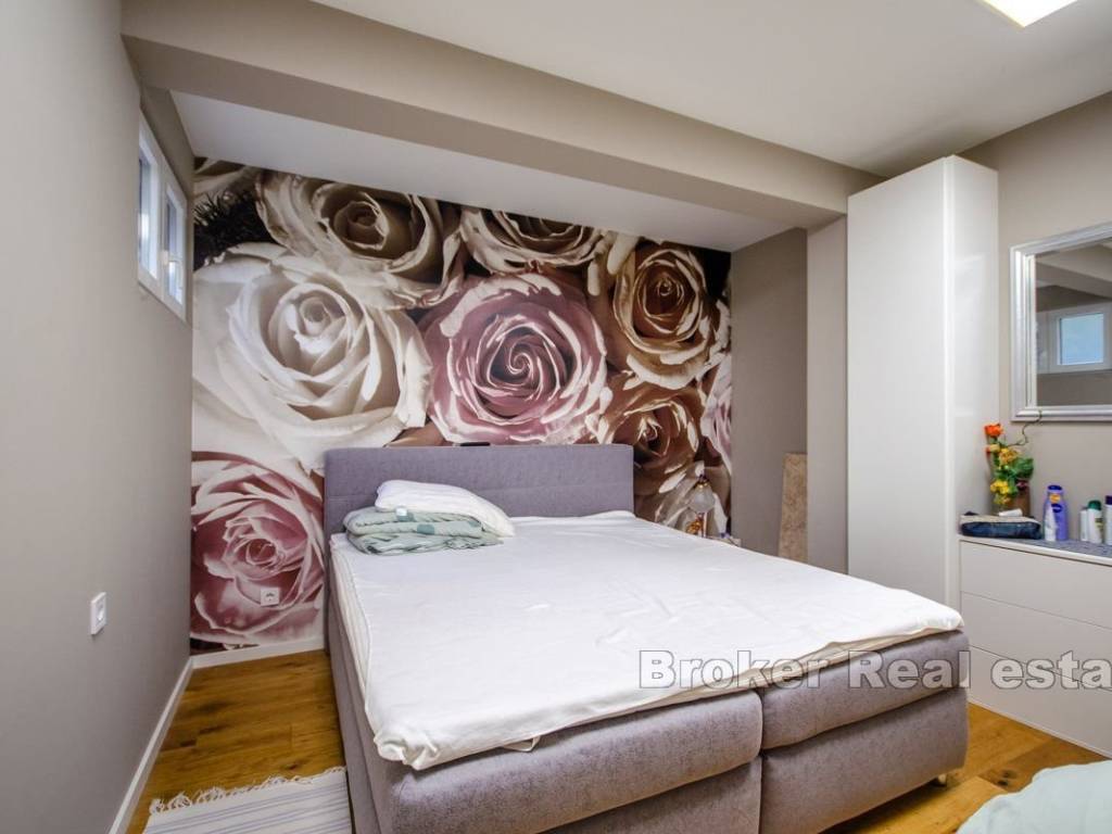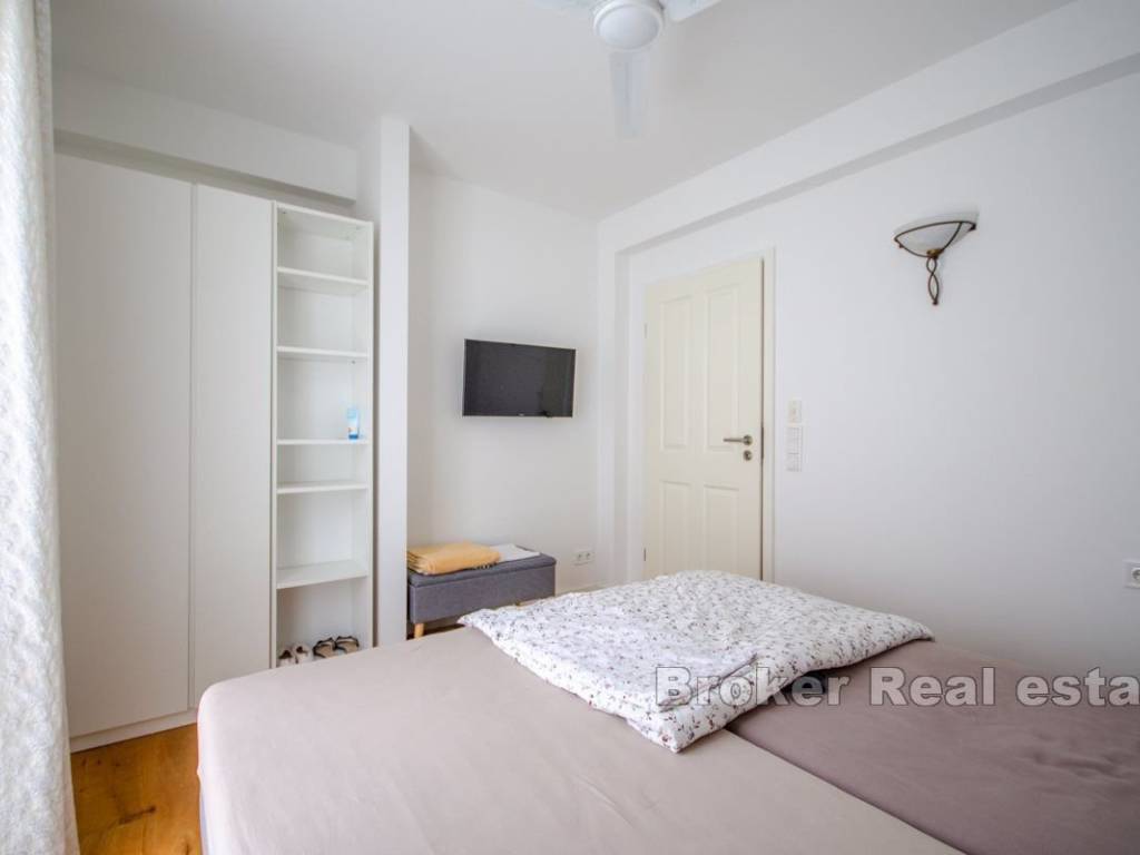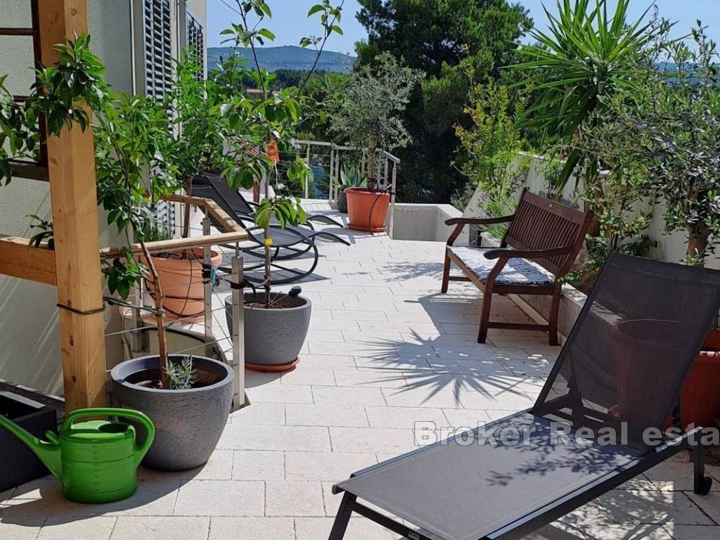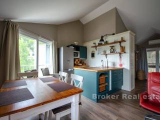 For sale is a villa with a sea view in one of the most attractive and beautiful coves on the island of Brac. The bay is located on the south side of the island, 5 minutes from the center of Milna, where there are all the necessary facilities for a pleasant life, such as restaurants, shops, cafes, bus line to Supetar. The villa consists of 3 floors, carefully designed and built from high-quality materials. There are 3 bedrooms on the ground floor, one of which has its own bathroom, while the other two rooms have access to a shared bathroom that has an entrance from the hallway. Also, on that floor there is also a room that serves as a storage room. From this floor there is access to a spacious terrace with a heated swimming pool. On the upper or middle floor there is a kitchen, a dining room and a spacious living room with access to a balcony with a view of the sea and the bay. Part of that terrace is covered and has an outdoor dining table. These two floors function as one unit, while the last floor functions as a one-room apartment with its own kitchen, living room and dining room, and also has a terrace with a view of the sea. The villa was built about 10 years ago, very well preserved and maintained, and is being sold fully furnished.