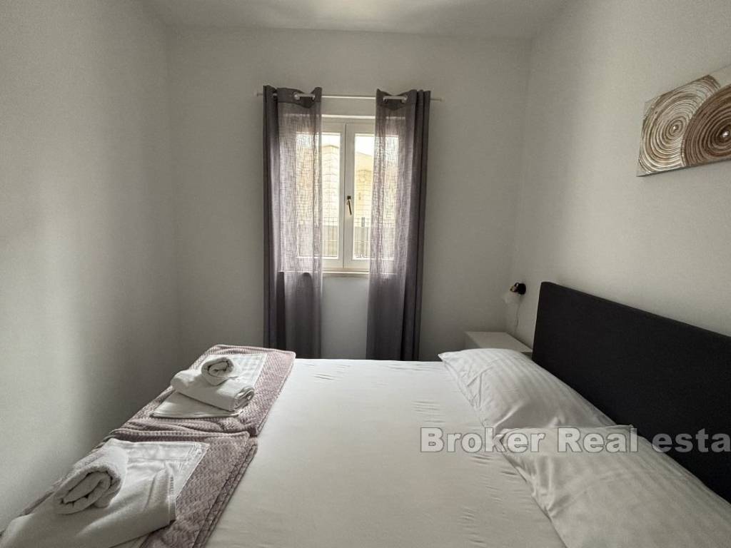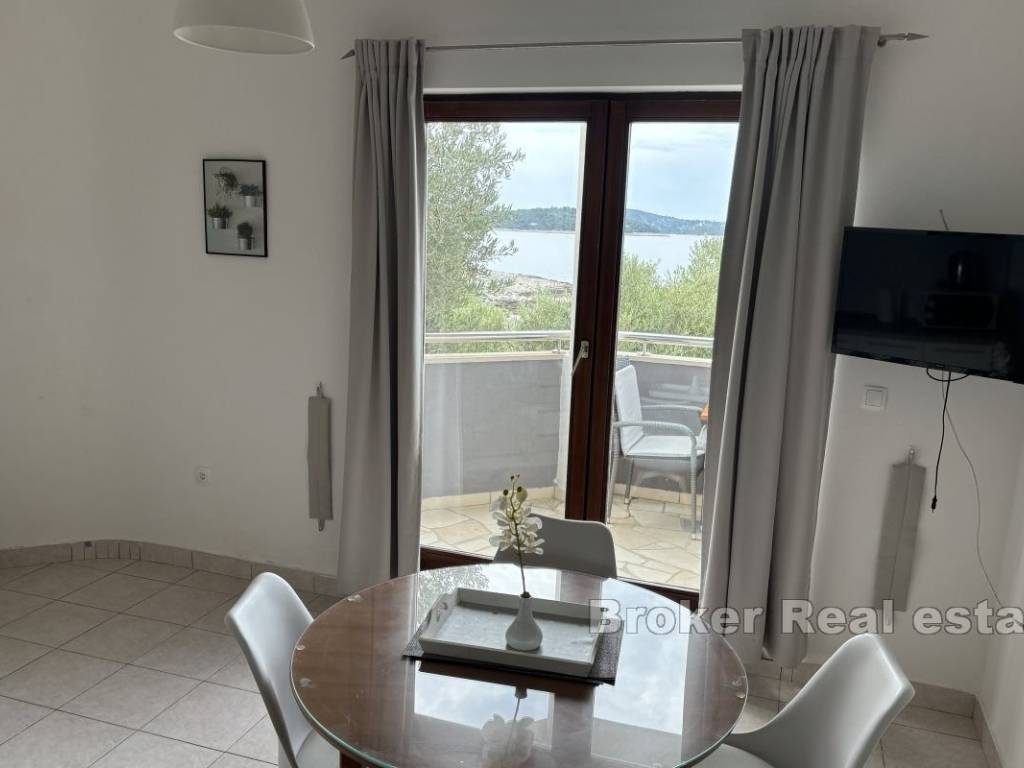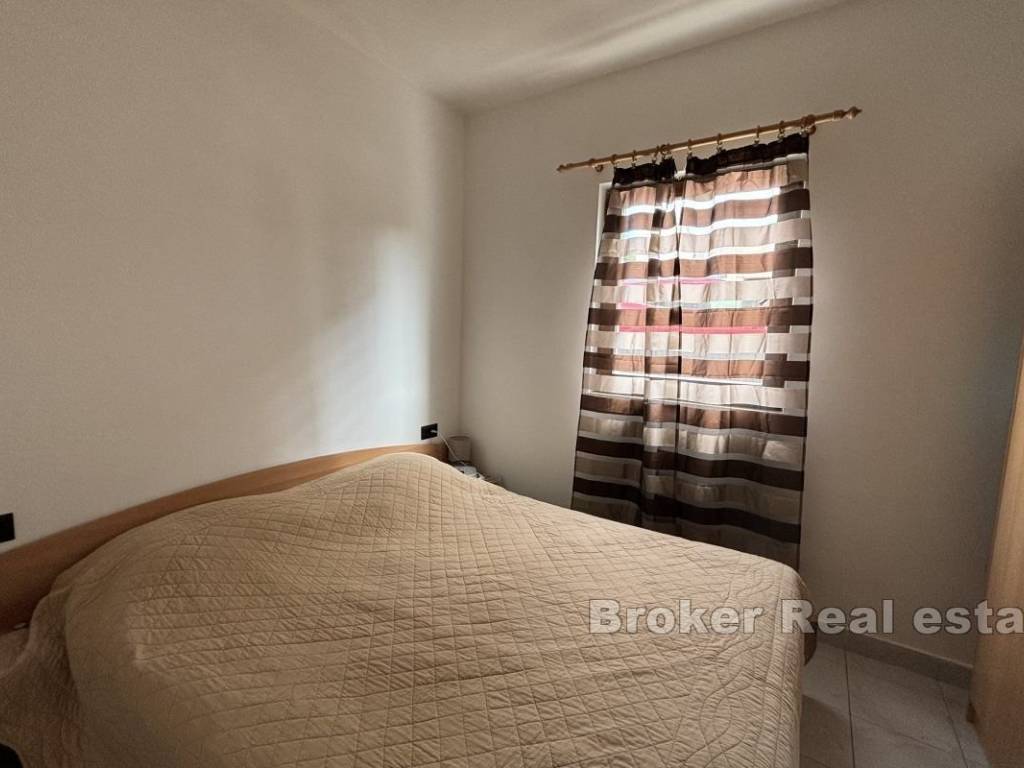 Three bedroom apartment with sea view, for sale. The apartment has a southern orientation and is located on the ground floor of the apartment house. It is located in the second row to the sea and is divided into two units.   The apartment has a total of 75,52 m² of living space and 29,94 m² of outdoor space and storage in the basement. The first unit is essentially a one bedroom apartment consisting of a kitchen, dining room and living room, as well as a bedroom and a terrace. The second unit consists of a hallway, anteroom, bathroom, kitchen with dining room, two bedrooms and a terrace. The apartment has two air conditioners and two outdoor parking spaces, one for each unit. It has been partially renovated and is being sold furnished and equipped.   The property is a high quality choice for tourist rental and is located near all facilities that are needed on vacation.
