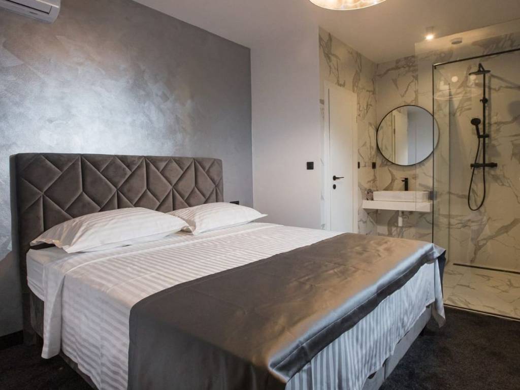 For sale is a detached house with a sea view located in the vicinity of the city of Split. The property has one floor and its total living area is 131 m2. It is located on a plot of land of 543 m2.   The property consists of an entrance hall, kitchen, dining room and living room. It has two bedrooms with private bathrooms and a guest toilet. From the living room there is a terrace and a yard with an infinity pool.   The property has several parking spaces and the garden is fully landscaped.   Given that the property is already established as a tourist rental, it is an ideal choice for those who want to continue with tourism, but also for those who want to spend time there throughout the year due to the proximity of all the facilities needed for a comfortable life.   The house is only 1000 m from the sea. 8 kilometers from the center of Split and 20 kilometers from Split Airport.