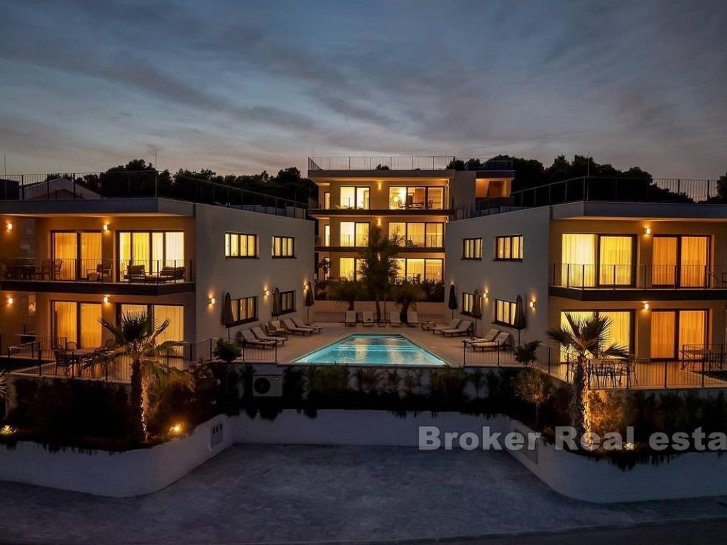 For sale is a modern, exclusive apartment on the ground floor, which is located in the first row to the sea and has a view of the crystal sea. It is located near Sućuraj on the island of Hvar. It is positioned on the south side and exudes the highest comfort, modern Italian interior and elegant design. It offers an ideal modern ambience with a unique view of the Mediterranean coast. With a lot of attention in Italian interior and exterior details, modern technical equipment, the latest building materials with a magical touch of glamour, this apartment provides a luxurious vacation for every family. The residential building is built on three floors and no one lives in it permanently, but the owner uses it for seasonal and off-season holidays.   It consists of 2 spacious bedrooms, 2 bathrooms, 2 toilets, a shared heated pool and quality garden furniture, a balcony and an open terrace, a garage and several outdoor parking spaces.   The apartment has a spacious living room for evening gatherings, a dining room and a kitchen from which you can go out to an open terrace for relaxation with a swimming pool. There are also 2 bedrooms, 2 bathrooms, 2 toilets, and a balcony. The apartment is fully air-conditioned and is called a smart apartment because all the technology works according to the digital principle. It has an automatic environmental irrigation system, a video camera security system installed and underfloor heating in the bathrooms.   The building is sold fully equipped and furnished with high-quality Italian interior and exterior (home appliances, flat screen TVs, LED lighting, automatic cooling system, etc.).   The property is a unique choice due to its southern position/Mediterranean climate, crystalline view of the clear sea, the architecture of the building and numerous beaches nearby. The place is 50 km from the nearest larger town Hvar on the island of Hvar.
