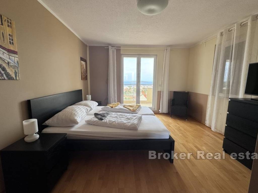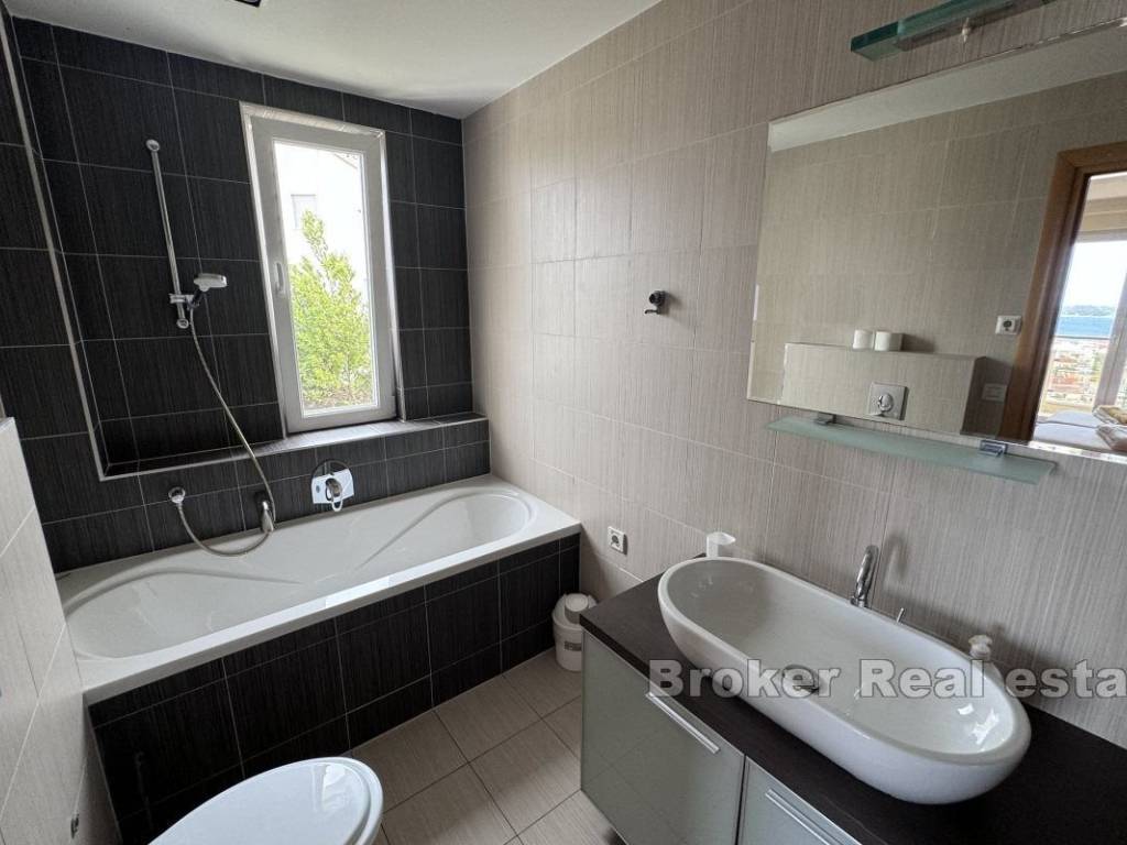 Furnished two-story apartment, located on the ground floor of a modern residential building. The apartment is fully furnished and equipped and is being sold in such condition. The total living area is 173 m2 and consists of a spacious entrance area, an elegant bathroom, a functional pantry, and a spacious living room with an open concept kitchen. The kitchen has direct access to a covered terrace equipped with furniture ideal for relaxing and socializing, especially during the summer months, with a beautiful view of the sea. An internal staircase leads to the upper floor where there are three comfortable bedrooms, each with its own bathroom. Two bedrooms have access to a balcony with an enchanting view of the sea. The apartment is air-conditioned and fully equipped for a pleasant stay. It is only 200 meters from the sea and the beach. It has a part of the yard with parking spaces for several cars. It is located in the center of Rogoznica, in the immediate vicinity of all necessary facilities such as restaurants, cafes, shops and beaches. Due to its exceptional location and position, the apartment is ideal for tourist purposes. Rogoznica is a quiet and picturesque village surrounded by a beautiful seascape and crystal clear sea. The city of Šibenik is 34 km away, Split airport is 32 km away, while Split itself is 50 km away.