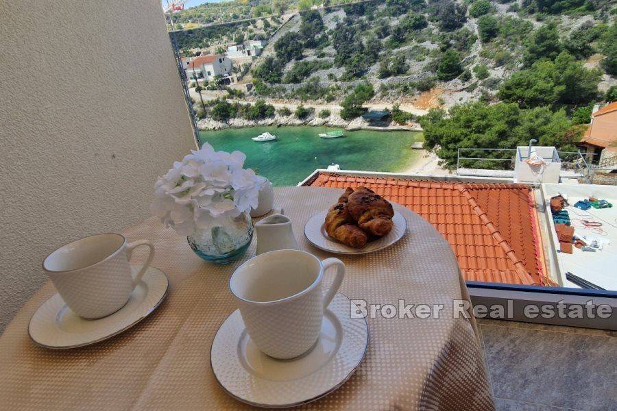 An semi-detached apartment house for sale, located in the second row from the sea, which is only 30 m away. The house has 240 square meters of living space and is located on a plot of land of 230 square meters, with a beautiful view of the sea. This property represents an ideal opportunity for those who want to enjoy the proximity of the sea and a beautiful view of the sea, with enough space for a comfortable life or vacation. The house consists of a basement and 3 floors. On the ground floor there is a studio apartment, with one room, bathroom and kitchen. On the first floor there is one one-room apartment consisting of 1 room, living room, kitchen, bathroom and toilet and balcony. On the same floor there is a two-room apartment with 2 bedrooms and two bathrooms, kitchen, living room with dining room and two balconies. The second floor, like the first floor, consists of a one-room apartment consisting of 1 room, a living room, a kitchen, a bathroom and a toilet, and a balcony, and on the same floor there is also a two-room apartment with 2 rooms and two bathrooms, a kitchen, a living room with a dining room and two balconies. The proximity to the sea and the beautiful beach in the bay provide an ideal combination of natural beauty and comfort, making it the perfect destination for a relaxing vacation or escape from the daily stress and bustle of life. In the immediate vicinity, there are also all facilities for a pleasant vacation, such as restaurants, shops, café bars…