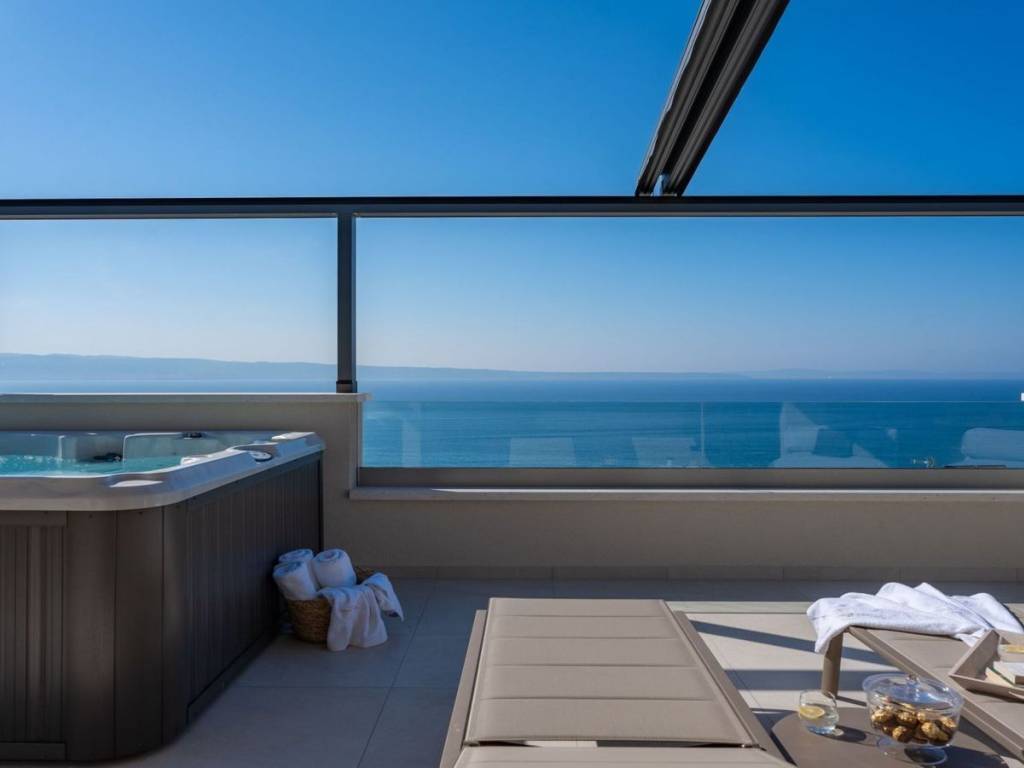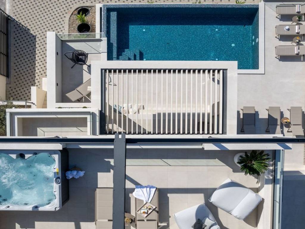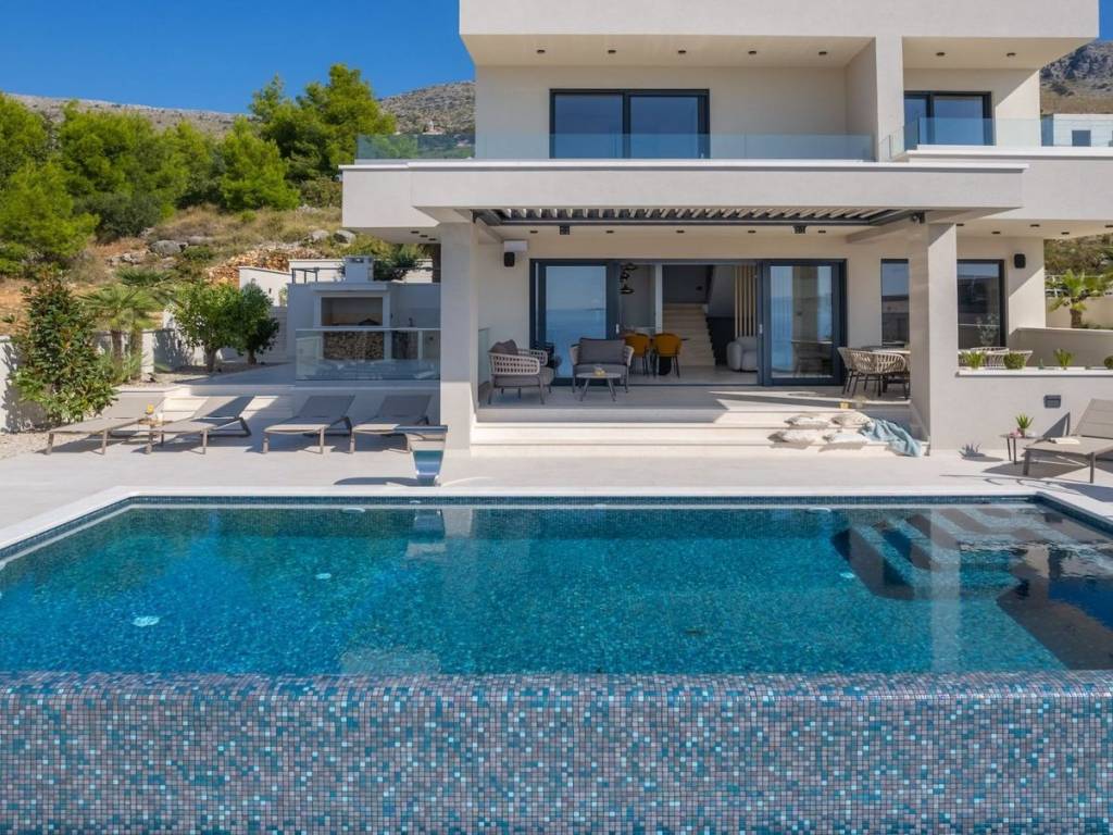 An extremely attractive newly built villa, located in a complex of villas of equal quality and similar design, offers a high standard of living. The villa was built on a plot of land of 640m2, and the total living area of the villa is about 350m2. It consists of 4 floors, of which the basement floor is intended to be for fun, so on that floor there is a large living room, bar, billiards, kitchen, bathroom,… On the ground floor there is also a large living room connected to the dining room, a kitchen, a guest toilet, and a bedroom with its own bathroom. On this floor, there is also an exit to a beautiful terrace with a swimming pool and a sundeck, from which there is an enchanting view of the sea. On the upper two floors there are 4 additional bedrooms, each with its own bathroom, balconies and loggias, and on the top floor there is a bar, a sauna, a terrace with a jacuzzi and a beautiful view of the sea. The villa is sold fully furnished and equipped, of high quality. There is an automatic irrigation system on the cultivated land, and there is also parking for several cars. The nearest beach is about 300 meters from the property, while the city of Split is about 10 km away.