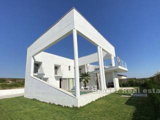 A unique property that exudes an interesting interior design paired with a striking exterior. The villa with a useful living area of 225m2 is located on a quiet plot of 500m2 with a view of the sea. The villa consists of a ground floor and a first floor where all the rooms are spacious with their own exit to the balcony or terrace. On the ground floor there is a spacious modern kitchen and living room, one bedroom with its own bathroom, and a shared toilet. Almost every room on the ground floor has access to the terrace with a swimming pool and sun deck. Internal stairs lead to the first floor, where there are three bedrooms, each of which has its own bathroom and access to a terrace or balcony that offers a phenomenal view. On the upper terrace there is a jacuzzi and an outdoor shower. All rooms are air-conditioned with built-in electric underfloor heating in the living room and bathrooms. From the living room on the ground floor there is access to a spacious terrace with a 32m2 swimming pool, next to which there is also a summer kitchen, a table and a barbecue. The villa is located in a great position, close to all essential facilities and away from the hustle of the city. Zadar is 6 km away, while the airport is only 8 km away. Also nearby are smaller maritime towns such as Pakoštan and Biograd na Moru, as well as national and nature parks.