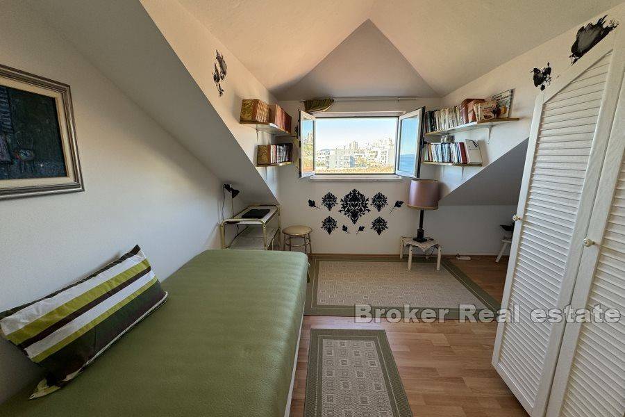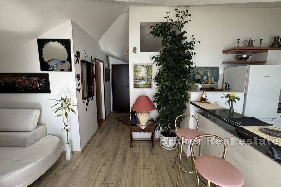A beautiful two-room apartment located in one of the most attractive parts of Split – Žnjan. Located on the last floor of a smaller building without an elevator, this apartment offers an outstanding open view of the sea. With a total living area of 85.50 m2, this attractive space is additionally enriched by a large balcony. This apartment has a high attic, which provides a special feeling of intimacy and comfort. It consists of an entrance hall that leads to two spacious rooms, a bathroom with a toilet and a living room connected to the kitchen and dining room. Oriented to the south, the apartment is abundant with natural light throughout the day, providing a pleasant environment for living. In addition to the extraordinary location by the sea, this apartment also offers practical benefits such as a parking space and a security blind door. Recently renovated, the apartment is equipped with new electrical installations and air conditioners. It is located in a quiet environment full of greenery, close to all essential facilities for life: shops, restaurants, kindergartens, schools and a beautiful beach. The location is well connected to the city center, the bus stop is located in the immediate vicinity of the building.