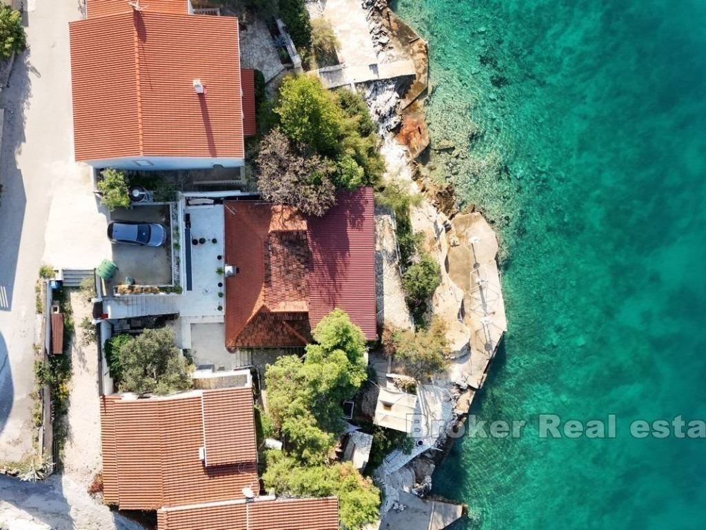 An apartment house is for sale, located in a smaller tourist settlement near Rogoznica. Built on a plot of land with an area of 550 m², it consists of 300 m² of living space, with a total of 4 apartments, two of which are three-bedroom and two are one-bedroom. This is an ideal location for those who want to enjoy unspoiled nature while being right by the sea, with direct access to a beautiful and natural rocky beach and a boat dock. A building permit has been obtained for the property, allowing the object to be further expanded and reconstructed up to a size of 400 m². In this case, the property could be transformed into a boutique hotel with a total of 7 one-bedroom apartments, one of which would be a penthouse with a rooftop terrace. It is also possible to reconstruct the house within the existing dimensions without the need for additional permits. In addition to offering rental apartments, the property also provides the opportunity for commercial use, including hospitality activities such as a restaurant on the part of the property that is not part of the house. The space is adapted and equipped for such activities, making it ideal for a combination of tourist accommodation and business purposes. All of the above opens up potential for the future owner to explore various additional possibilities that this property offers. Nearby, all essential amenities are present, with Split Airport located 21 km away by air and one of the largest marinas in the vicinity. The center of Rogoznica is 7 km away by air, and the center of Trogir is 16 km away by air. There is also a boat dock, further expanding the existing offer. Located in an excellent micro-location, the property enjoys all the advantages of its outstanding position, providing easy access and visibility, which are crucial for successful business operations and attracting guests.