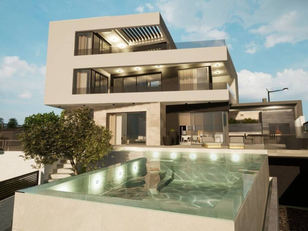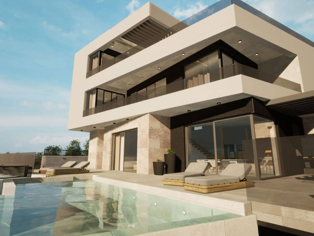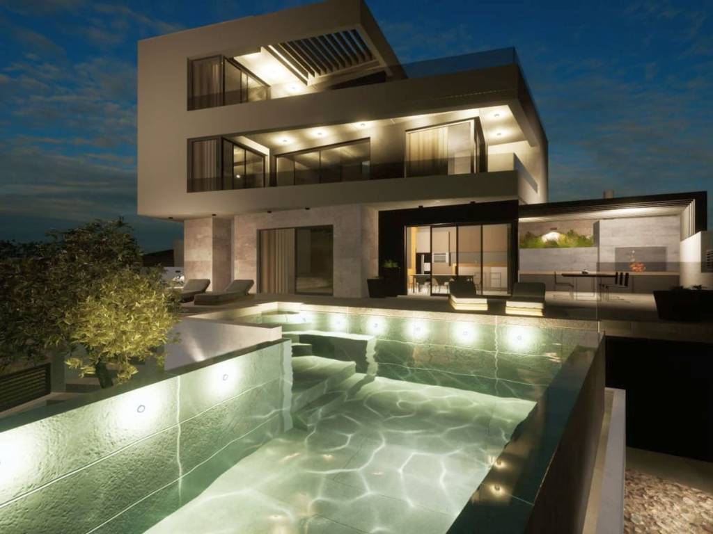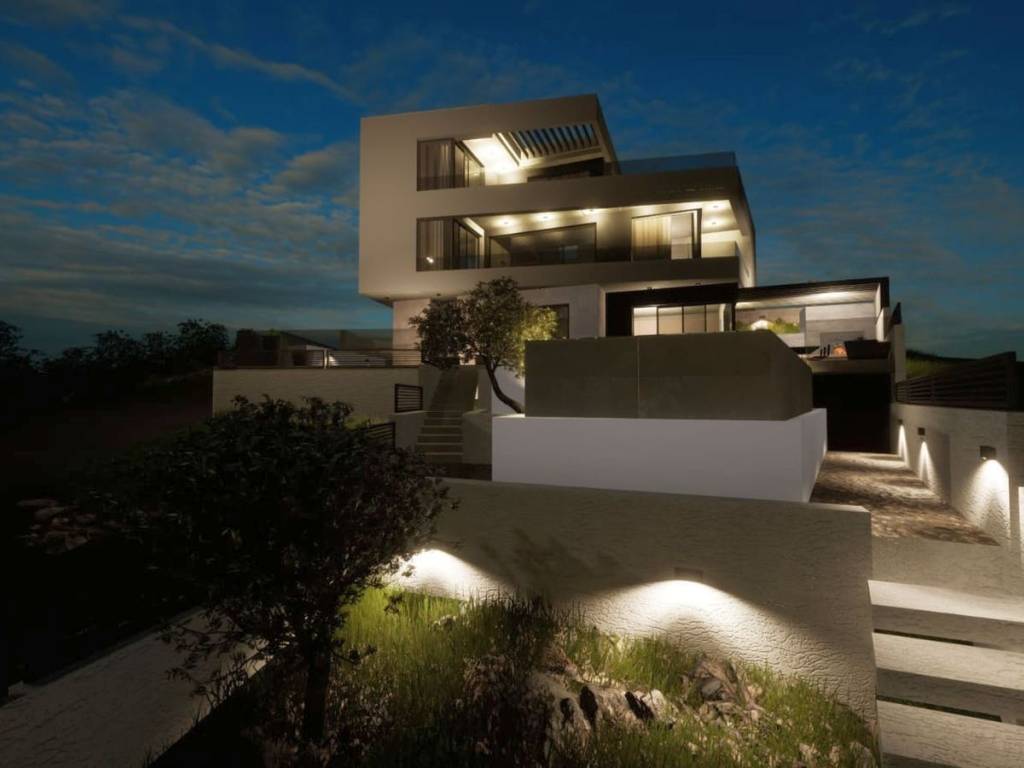 For sale is a modern villa located near the town of Rogoznica, in an elite settlement where villas and holiday homes predominate. It is a property of 286 m2 of living space, located on a plot of land with a total size of 554 m2, spread over three floors. The ground floor has a total size of 93 m2 and consists of an entrance, kitchen and dining room, living room, bathroom, laundry room and wardrobe. The ground floor also has an internal staircase and a covered part of the terrace. On the first floor, which has a total size of 83 m2, there are two bedrooms, two bathrooms and a toilet, a wardrobe, a gallery, an internal staircase and a covered terrace. On the second floor, which has 53.41 m2 of living space, there is a bedroom, a bathroom, a toilet, a wardrobe, a covered and uncovered part of the terrace and a gallery. In the yard there is a 33 m2 swimming pool and a jacuzzi with a panoramic view of the sea. Parking for two cars is provided. There is a possibility of buying a plot of land of 76 m2 intended for additional parking. The villa is located in an area ideal for tourism, but also for living, given the proximity of all necessary amenities. It is sold fully furnished and equipped.