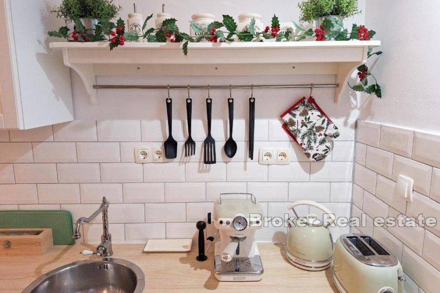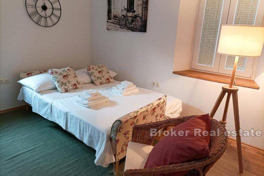 This one-bedroom apartment is located in a traditional Mediterranean stone house in the heart of old Trogir, which exudes charm and historical character. The apartment, with a total living area of 60 m², offers exceptional comfort across three floors, perfectly suited for a family vacation or tourist rental.   The ground floor of the apartment contains a modern, fully equipped kitchen that is ideal for preparing all meals with a Mediterranean accent. The kitchen is connected to a spacious dining room, which allows for pleasant meals and family gatherings. The bathroom with shower, also located on the ground floor, offers functionality and comfort in everyday life.   The first floor of the apartment offers a spacious living room, ideal for relaxing. There is also an extra bed here, perfect for additional guests, and the balcony offers an incredible view of the old town of Trogir. The balcony is the perfect place to enjoy your morning coffee or evening hours, and the intimacy provided by the location in the heart of the old town makes the stay even more enjoyable.   The second floor is dedicated to an elegantly decorated bedroom that exudes sophistication and comfort. This room offers privacy and relaxation, and is equipped with its own toilet, which further increases the level of comfort. The interior has been carefully selected to maintain an authentic Mediterranean charm, while at the same time offering modern amenities that meet all the needs of guests.   This apartment is located in the heart of the old town, just 60 meters from the sea, which allows easy access to all the sights and amenities of Trogir. There are numerous restaurants, cafes and shops nearby, making it an excellent choice for those who want to be in the center of things. Due to its location, the apartment represents a perfect opportunity for a tourist rental, as it offers an excellent price-quality ratio, with an irresistible Mediterranean atmosphere.   Ideal for a family vacation, romantic getaways or as an investment for a tourist rental, this apartment offers everything you need for a comfortable, practical and unforgettable stay in Trogir.