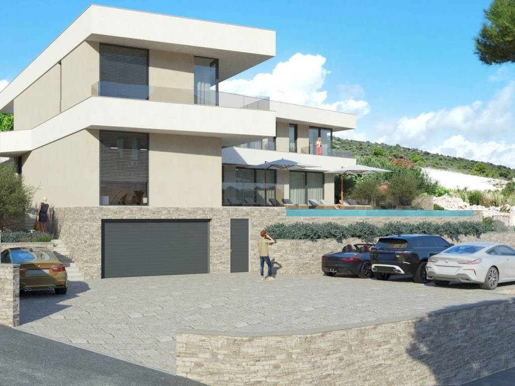 This villa is located in a peaceful and picturesque setting, just a few meters from the sea and beach, on a plot of 1100 m². With three levels – basement, ground floor, and first floor – the villa offers top-tier luxury and comfort, making it ideal as a family home, modern weekend retreat, or a lucrative investment for tourist rentals.   The basement is equipped with a garage, technical room, laundry room, storage, and hallway, providing additional space for storage and functionality. The ground floor includes a relaxation room with a sauna, a gym, a toilet, as well as a spacious living room and kitchen with a dining area, all perfect for enjoying family moments and relaxation. On the first floor, you’ll find an entertainment space and five luxurious bedrooms, each with its own en-suite bathroom. Every bedroom has access to covered balconies, offering spectacular views of the sea and surroundings, creating the perfect environment for relaxation. The villa is equipped with an elevator, ensuring easy access to all levels.   The exterior is a true paradise, featuring a 68.94 m² pool with a sunbathing area, ideal for sunbathing and outdoor enjoyment. The summer kitchen and spacious terraces provide the perfect setting for family gatherings and entertainment, especially during the summer months. With its exceptional location near the sea, this villa offers a high standard of living in a unique setting and presents an outstanding investment opportunity. The stated price refers to the villa in the roh-bau phase.