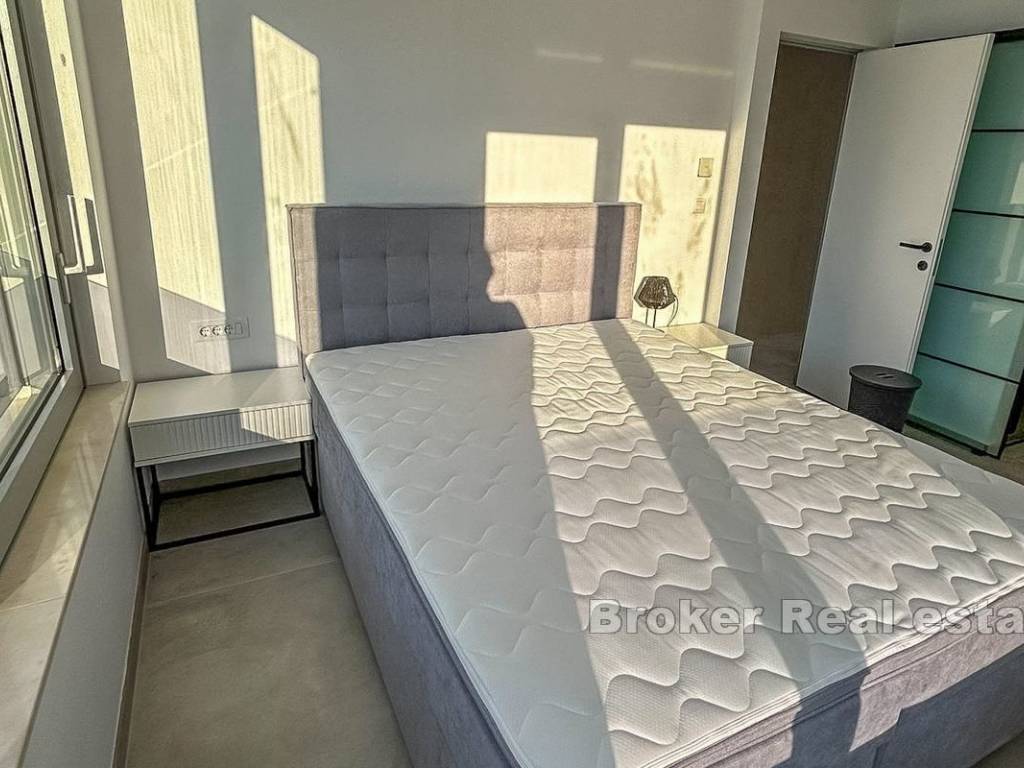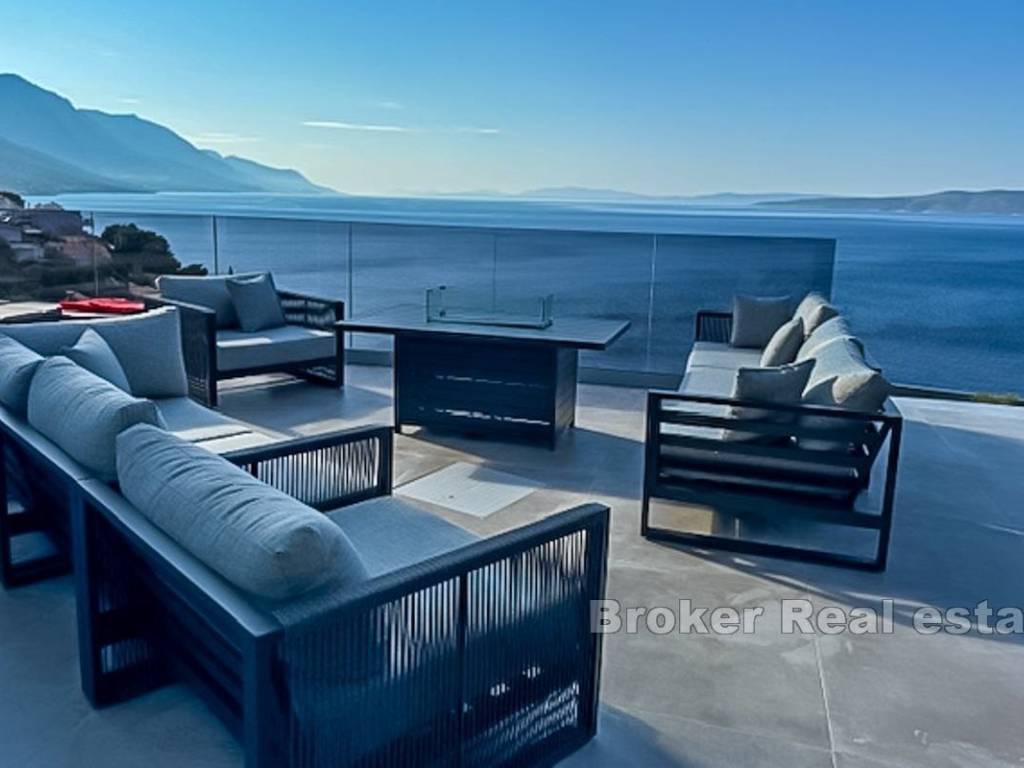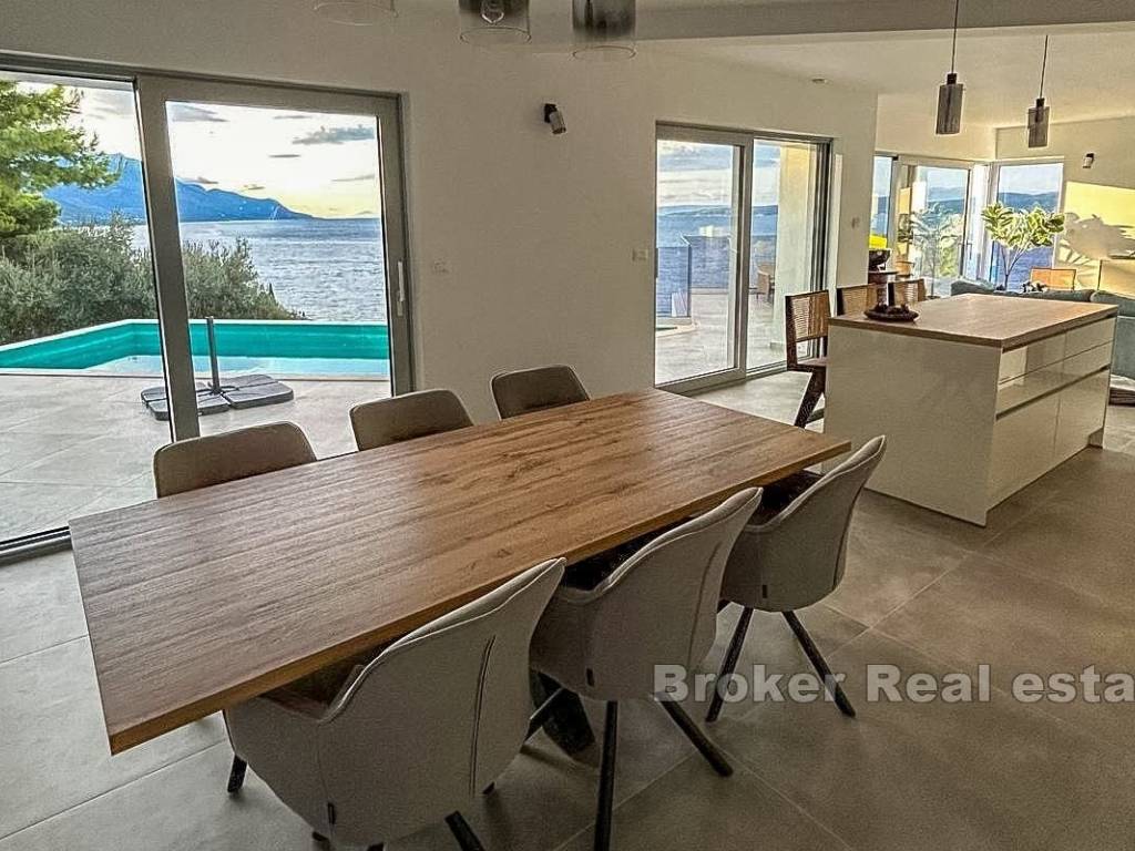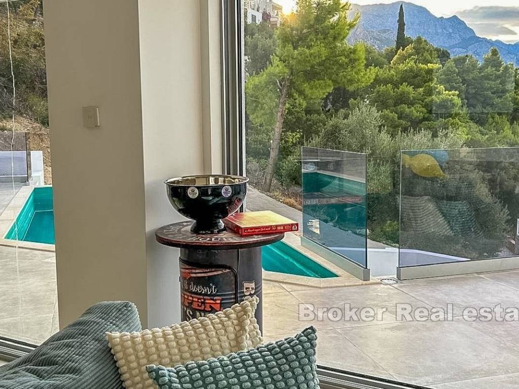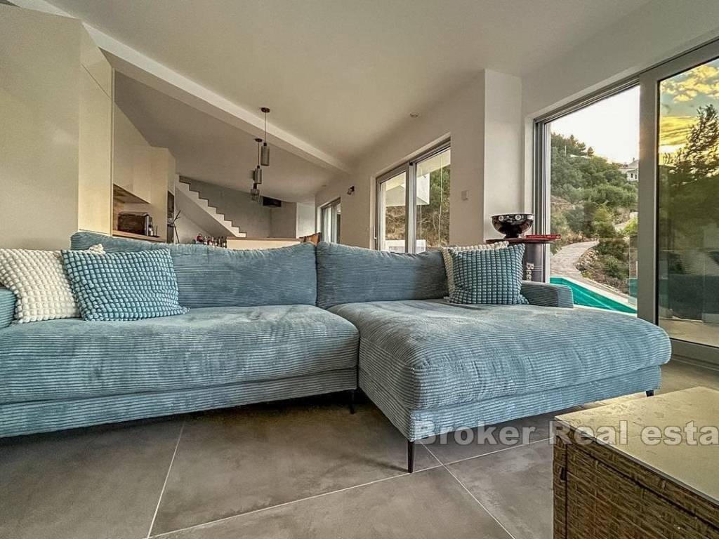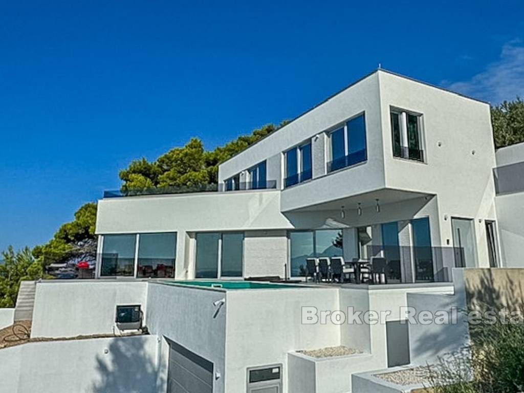 This modern and luxurious villa, located in a picturesque area near Omiš, embodies a blend of contemporary design and natural beauty.   The villa spans three levels – basement, ground floor, and upper floor – each offering unobstructed sea views.   In the basement, there is a spacious garage, a technical room, and a laundry room, with two additional outdoor parking spaces in front of the villa.   The first floor features an open-concept dining and living area with large glass walls leading to a terrace with a sun deck, pool, and outdoor kitchen. This level also includes a larger kitchen and an additional bathroom.   On the top floor, there are three bedrooms, each with its own bathroom. The master bedroom is equipped with a large bathtub, while the other two bedrooms have access to a terrace with breathtaking panoramic sea views.   The villa is fitted with a modern Harreither heating and cooling system and a video security system. It is sold fully furnished, ready for immediate move-in.