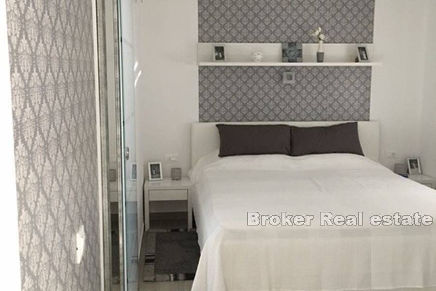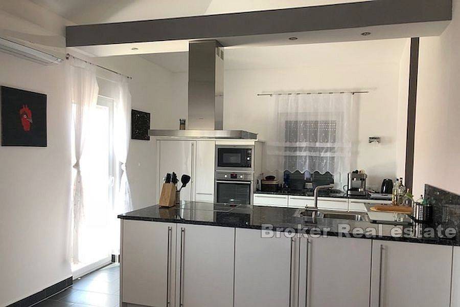 New house on the island of Brač with open sea view. The house of 236 m2 has: 2 bedrooms, 3 bathrooms, 2 wardrobes, hallway, spacious living room of 60 m2 with dining area, fully equipped and equipped kitchen (imported from Germany, high quality with all appliances), loggia, a total of 5 terraces front terrace 52 m2). In the basement there are 2 fully furnished apartments of 46 m2 and 38m2. The house was built with exceptional quality in 2014. on a plot of 720 m2, located in a quiet part of town just 5 minutes walk to the beach and 10 minutes to the center.  In addition, there are installations for central, solar, air conditioning, modern carpentry with electric shutters, video surveillance. Energ. certified. B.