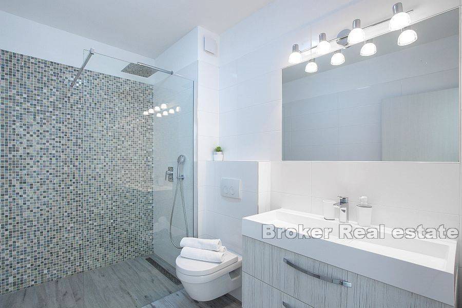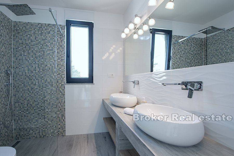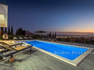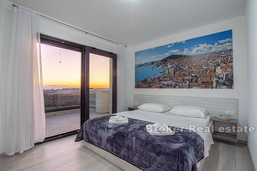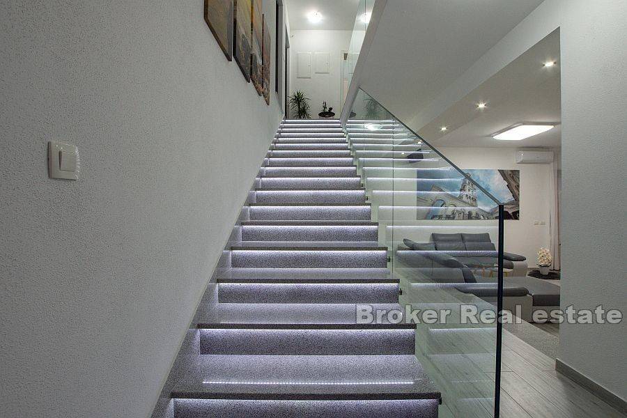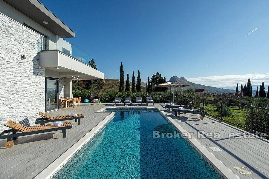 Beautiful villa with a total living area of 310 m2 in a quiet place near Split, built on a plot of 978 m2. It consists of two floors, and the interior of the house is modernly equipped with quality materials. On the first floor there is a bathroom, a bedroom and a kitchen with a dining room and a living room with access to a spacious terrace with outdoor furniture and a swimming pool. The terrace offers a magnificent view of the sea, which is an unavoidable factor. On the second floor there are three bedrooms, each with its own bathroom and exit to the balcony. The southern orientation ensures that the villa is sunny throughout the day. The villa has 6 air conditioners, the whole ground floor has underfloor heating and there is preparation for a heat pump. The villa was built in 2018. The price includes furniture. The property has a garage of 40 m2. Distance from the sea is 6 km, and from the center of Split 9 km. It is an excellent combination for a family vacation as well as for tourist rental, and is a great offer for investors as it offers them many opportunities.