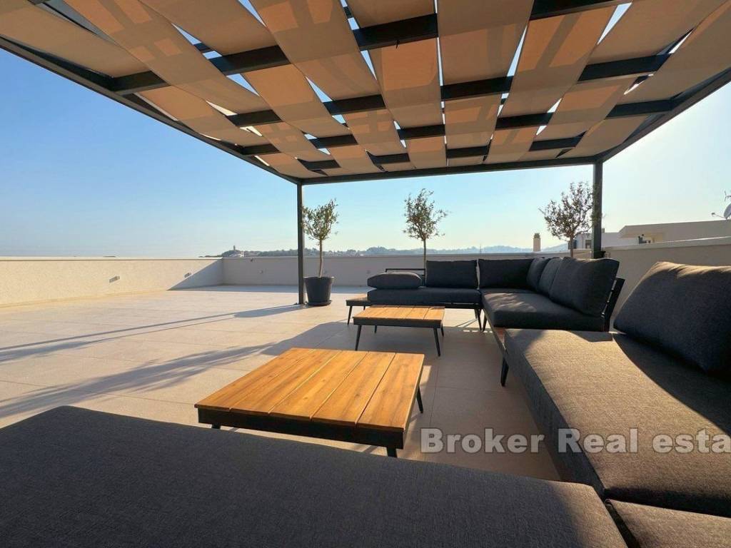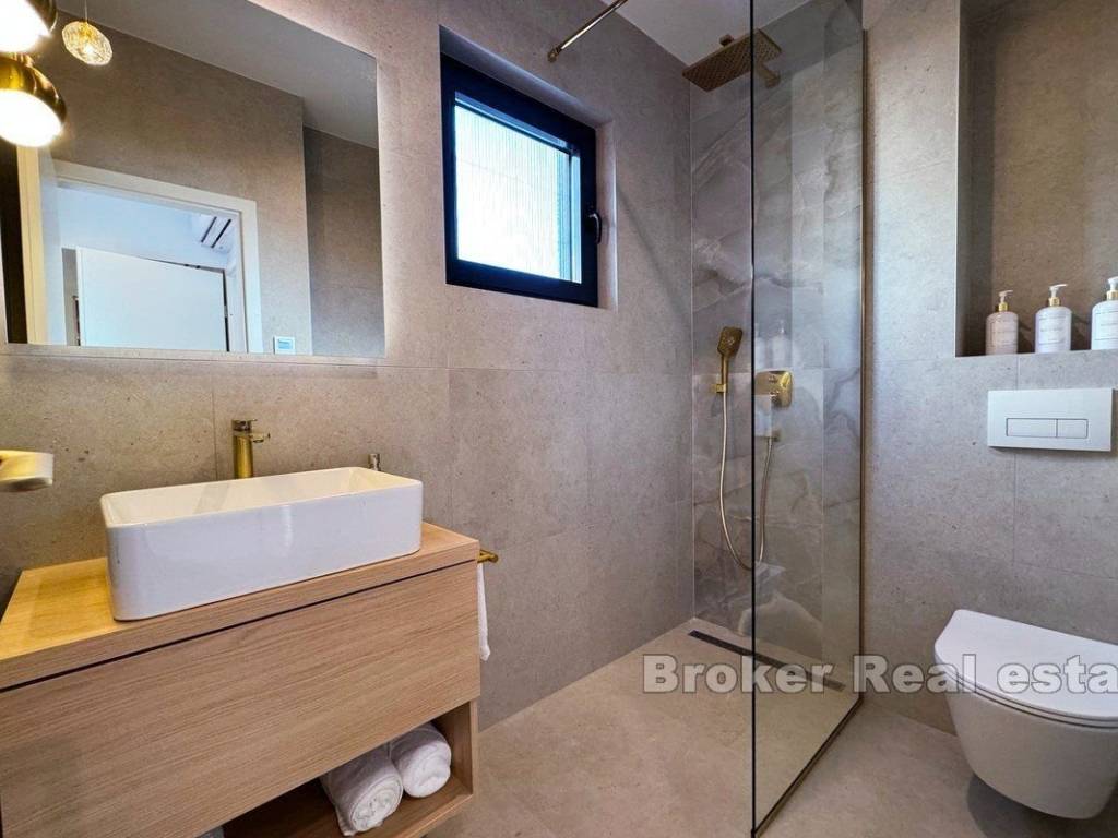 This modern, newly built villa with a swimming pool and jacuzzi is the perfect choice for those looking for a luxurious home or investment on the eastern side of Split. Situated on a plot of 780 m², the villa has a spacious living area of 360 m², providing enough space for a comfortable family life or a tourist rental. The layout of the rooms ensures maximum functionality and comfort. In the basement there is a gym, a playroom and a laundry room, which enables an active and organized lifestyle. The ground floor includes an elegantly decorated kitchen, a dining room, a spacious living room, a sauna and two rooms with private bathrooms, ideal for the privacy and comfort of guests. On the first floor, there are four rooms, each with its own bathroom, and a study, perfect for business duties or hobbies. The roof terrace, accessed by a separate entrance, offers a beautiful view of the sea, perfect for relaxation. The spacious garden, decorated with Mediterranean plants, further enriches the experience of living on this property. Enjoying the pool, jacuzzi and beautifully decorated summer kitchen with barbecue makes this villa ideal for relaxation and social gatherings. The villa is sold fully furnished, and thanks to its quiet location and proximity to the sea, it is an excellent choice for year-round family life, but also as an investment opportunity in tourism, given the excellent occupancy so far.