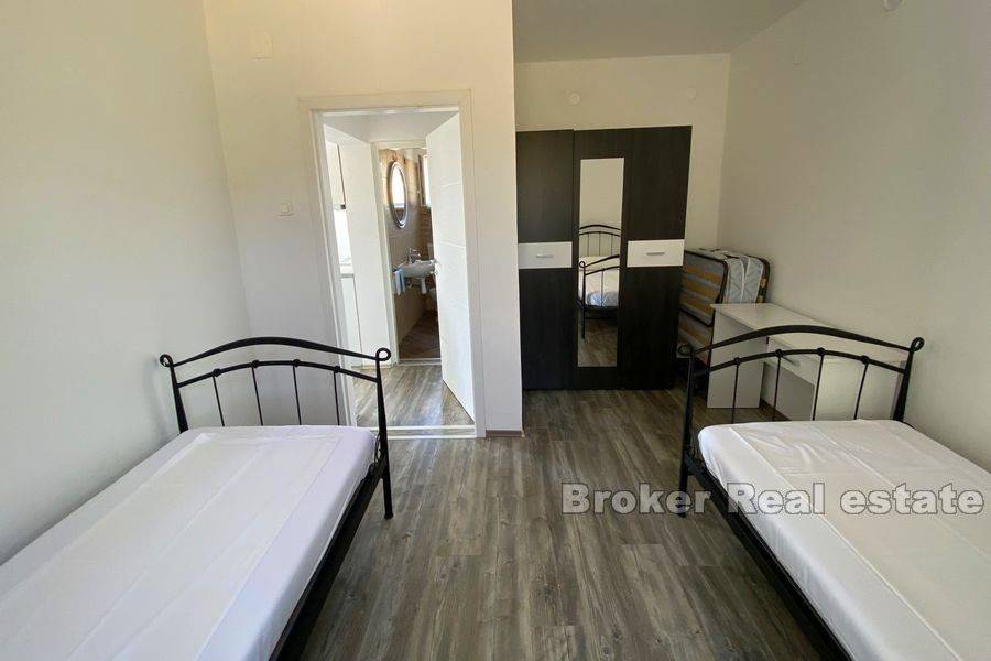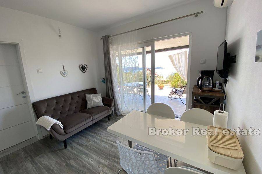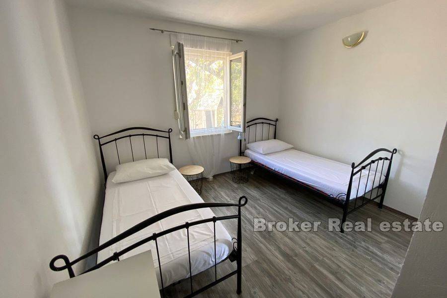 The house with a smaller living area of 65 m2 is located on a plot of 776 m2 with an exceptional view of the sea. A lot of effort was put into the house and garden, which can be seen in the contents and decoration. The yard includes a parking lot with at least 4 parking spaces, a swimming pool, a barbecue, and rich horticulture that significantly affects the landscaping. The house consists of a kitchen, a dining room and a small living room with access to a covered terrace, two bedrooms and one bathroom. On the north side of the house there is a storage room of 6m2 for which there is a possibility of arranging another bathroom because all the installations and openings have been carried out. The modern style of decoration fits in with the area where the house is located. The exceptional view from the spacious terrace will not leave anyone indifferent. The house is ideal as a family holiday home or as an investment due to the already well-established tourist business, which has proven to be extremely successful in recent years.