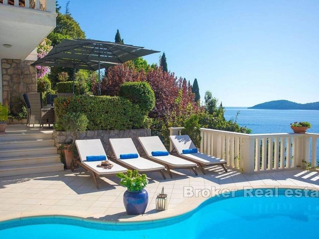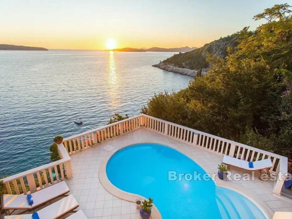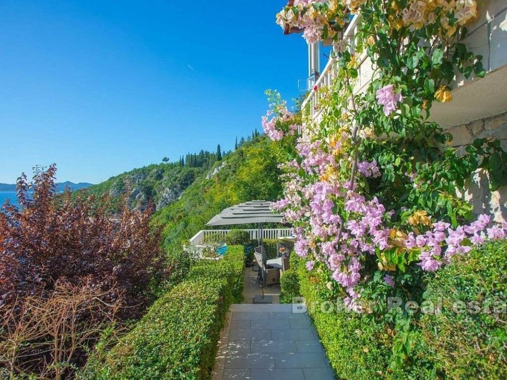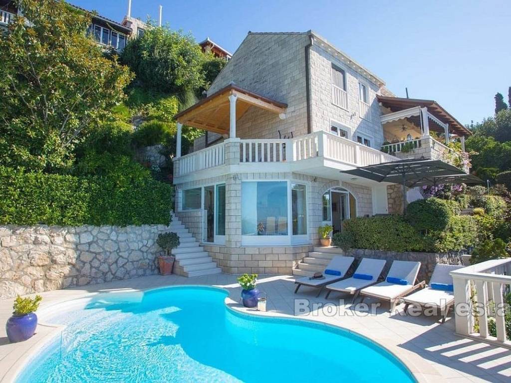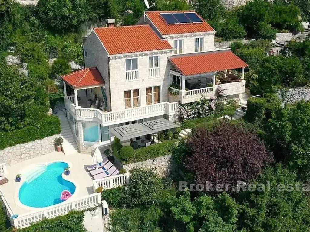 Located in a village near Dubrovnik, this beautiful house with an impressive panoramic view represents a rare opportunity on the market. This authentic house made of stone is surrounded by a Mediterranean garden and the entire property overlooks the crystal clear sea that stretches directly in front of it.   The total land area is 950 m2 with three floors with a total living area of ​​200 m2, which are organized as follows:   The ground floor is designed as an open, bright space where there is a bathroom, a kitchen with a dining room and a living room with access to a spacious terrace with a swimming pool and outdoor furniture with a barbecue. The upper floor has a bathroom, a kitchen with a dining room, a living room and a covered terrace. The last floor is arranged in such a way that there are three bedrooms, each with its own bathroom, and another bedroom that is currently used as a dressing room.   Each of the floors has its own separate entrance, which allows the future owner different options of use, from private accommodation to tourist rental.   The property has a total of four parking spaces and is 12 km from the center of Dubrovnik by air. This property represents an oasis of peace with a breathtaking view, and the additional potential is the continuation of the well-established tourist business.