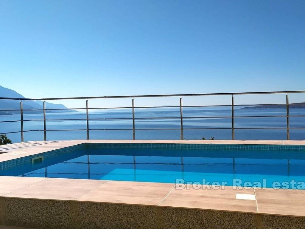 Omiš riviera house in the first row to the sea above a beautiful beach with crystal clear sea. The property is located in a quiet location, on an elevated position that offers a beautiful open view of the sea and nearby islands. The house is located on a plot of 415 m2 and is spread over three floors: – In the basement there is a separate studio apartment with bathroom and kitchen. This space is often used by the owners to stay in the summer months when the rest of the house is used for commercial tourism purposes. – On the ground floor there is a comfortable three-room apartment that has direct communication with a large sundeck, a swimming pool and a summer kitchen with a fireplace. – On the floor, which can be reached by an external staircase, there is a new comfortable three-room south-facing apartment with a terrace and an open view. The house is fully furnished and has 4 parking spaces. Shops and restaurants are located in the center of this small town, while the town of Omiš is a 10-minute drive away.