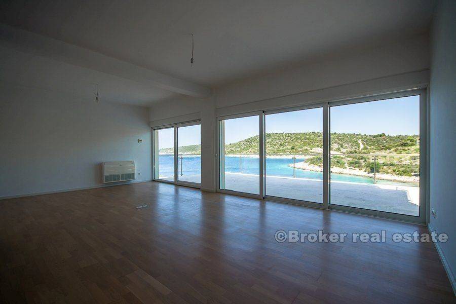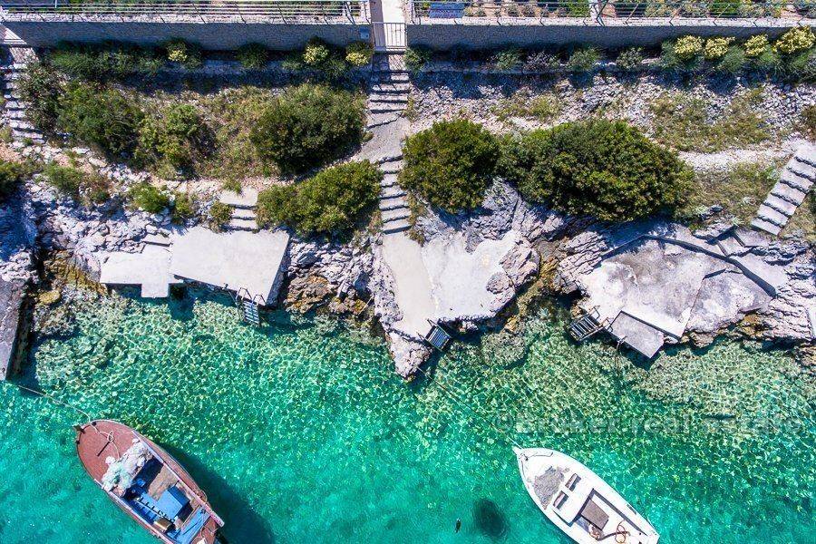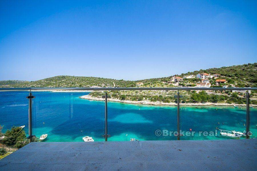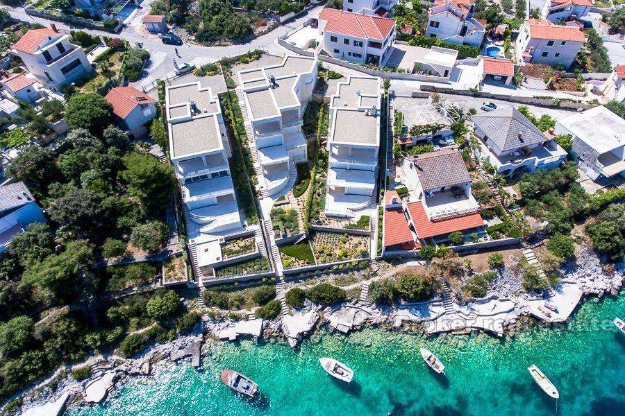 Near Rogoznica, in small village Kanica with beautiful bay, are situated these three villas for sale. All three villas are still available for sale, and their prices are different based on their position: Vila A – 1.350.000 EUR – SOLD Vila B – 1.290.000 EUR Vila C – 1.310.000 EUR The villa has three floors, own access to the sea, and own swimming area. The villa is only separated from the sea by a few steps. The large terraces have enough space for relaxing, a sun bath, or a leisurely dinner with friends. Three baths and three bedrooms perfectly accommodate even large families. The villa is built according to the highest standards, in order to guarantee you the maximum in comfort and luxury. Villa has 602 m2 of land space, which 230 m2 is cultivated land area.  Total living area is 390 m2. On ground floor there is 107 m2 of living area, on first floor is 127 m2 and last floor is 155 m2.  This modern villa is newly built, and only high quality materials were used for building. A high-grade, solid construction according to Austrian standards is the basis for lasting satisfaction and property value. Some of the features are: Heated floors, Air conditioning, Floor-to-ceiling doors, Parquet floors, Natural stone, Garden irrigation, Satellite reception, Security entry doors, Electric blinds, Electric garage door..  Kanica is just few minutes from the Rogoznica town, where are situated shops, restaurants, bars, marina, etc. From Split International airport there is less then 30 minutes drive. It is also very close to National Park Krka and National Park Kornati.