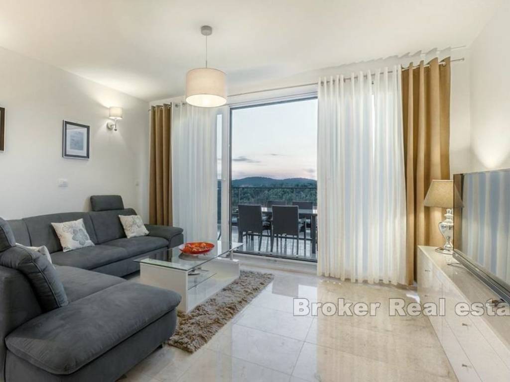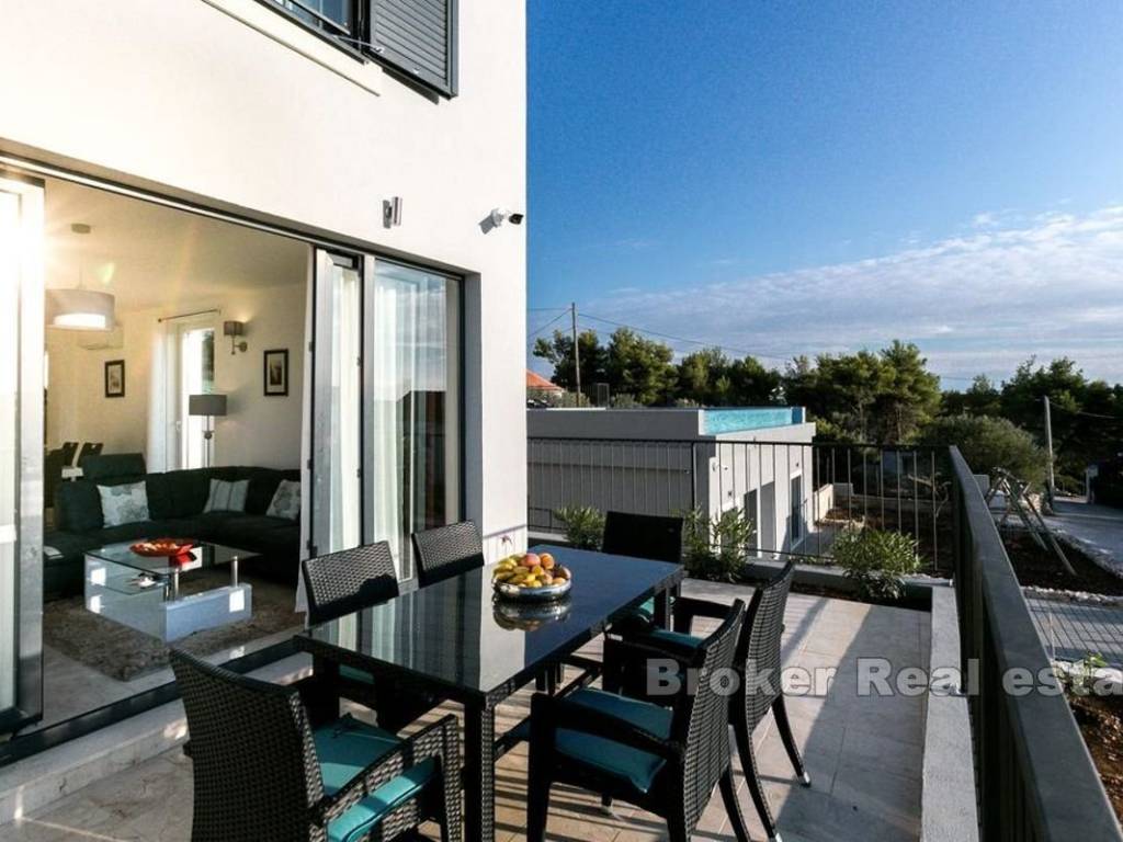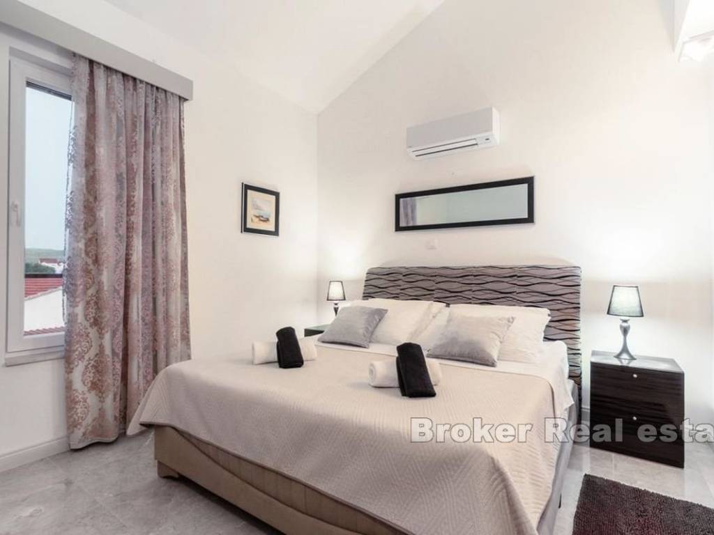 For sale is a villa consisting of three luxury apartments, vertically divided into three units. Each apartment extends over three floors with an area of 150 m2, each with four bedrooms. All three apartments have an open view of the sea. In addition to luxury, this property abounds with a communal infinity pool and a spacious outdoor area ideal for relaxing and sunbathing during the summer months. Additional amenities include a separate area with a two-bedroom suite, office/storage space, laundry and parking. In addition to the villa, a building plot of 1,250 m2 is for sale with approval for the construction of two more buildings. The construction of one building with three apartments and a swimming pool, similar to the existing property, is planned, and the second part would be a villa.