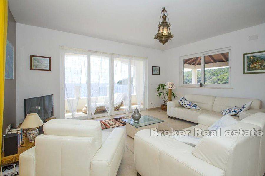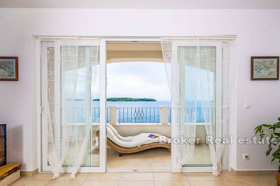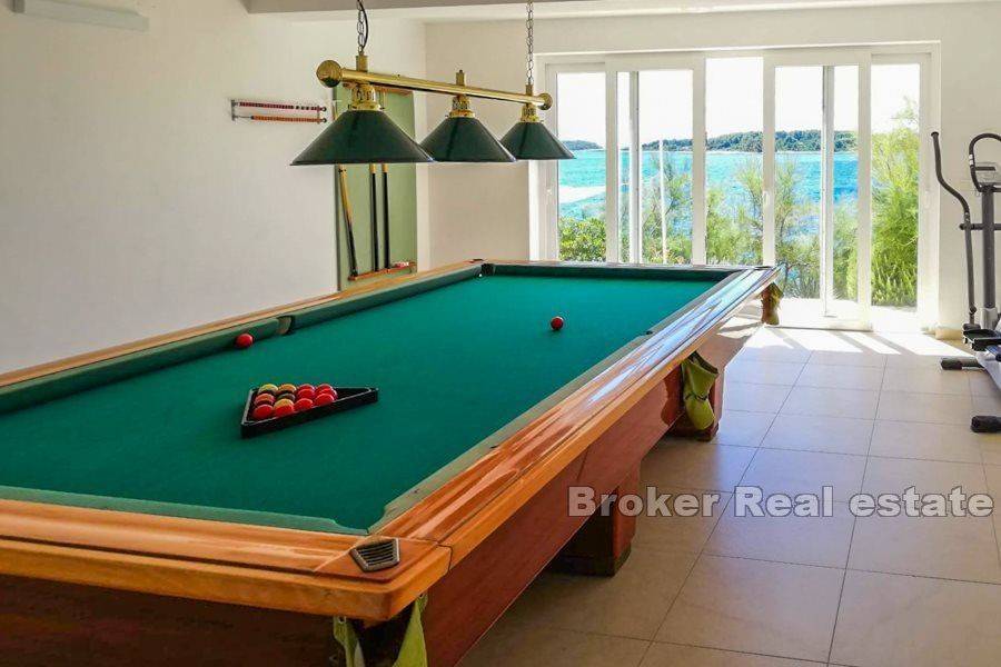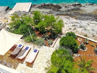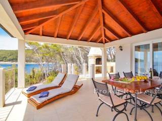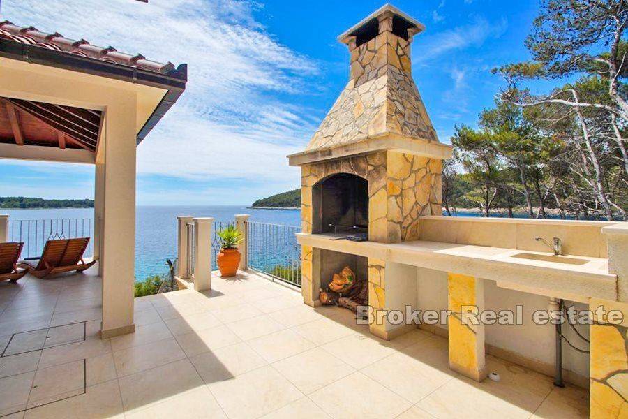 In one of the most attractive bays on the south side of the island of Korčula is located a modern villa of southern orientation in the first row to the sea. The villa with a living area of 250m2 is located on a plot of 678m2 and spreads over three floors. On the ground floor there are two smaller rooms that offer the possibility of use for the purpose of a gym, sauna, pantry or workshop, wine cellar, billiards and a spacious terrace with sunbathing area. An external staircase leads to the first floor floor where there is one bedroom, bathroom, kitchen and dining room and living room with access to the terrace. On the terrace there is an outdoor fireplace and dining area. An internal staircase leads to the second floor floor which consists of three bedrooms, two bathrooms and a terrace with a jacuzzi. The terrace offers a stunning open sea view. It has three parking spaces and a berth for a boat in front of the villa. Cultivated garden and pine forest bordering the villa and the beach at a distance of 2m make an ideal combination of real estate and nature.