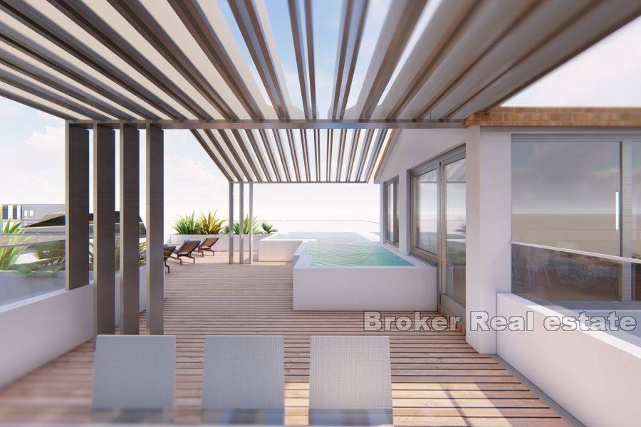 The property is located on a 1383 m2 plot of land. The living area of the property is 430 m2, and every floor offers a panoramic view of the sea and the city. The property extends over 3 floors with a roof terrace at the top. The ground floor of the property is designed as one apartment with two bedrooms, a kitchen with a dining room and a living room, a storage room and a bathroom and a large terrace in front with an unobstructed view of the city and the sea. External stairs lead to the first floor, where a two-story apartment with a swimming pool and a large, spacious terrace is designed. It is arranged in such a way that on the first floor there are four bedrooms, two bathrooms, a toilet, a pantry, a boiler room and a room for fines. On the second floor there is a kitchen with an island, a dining room, a living room, a toilet and a large spacious terrace with a swimming pool that offers an excellent panoramic view, which is exactly what this space offers, an open view from the living room and kitchen. The villa is a great opportunity to solve the issue of a cottage and holiday or, on the other hand, tourist rental. It is sold in Roh-bau condition, the new owner has the option of decorating the interior according to his wishes. It is only 13 km from the center of Split, and the surrounding area has all the necessary facilities for life.