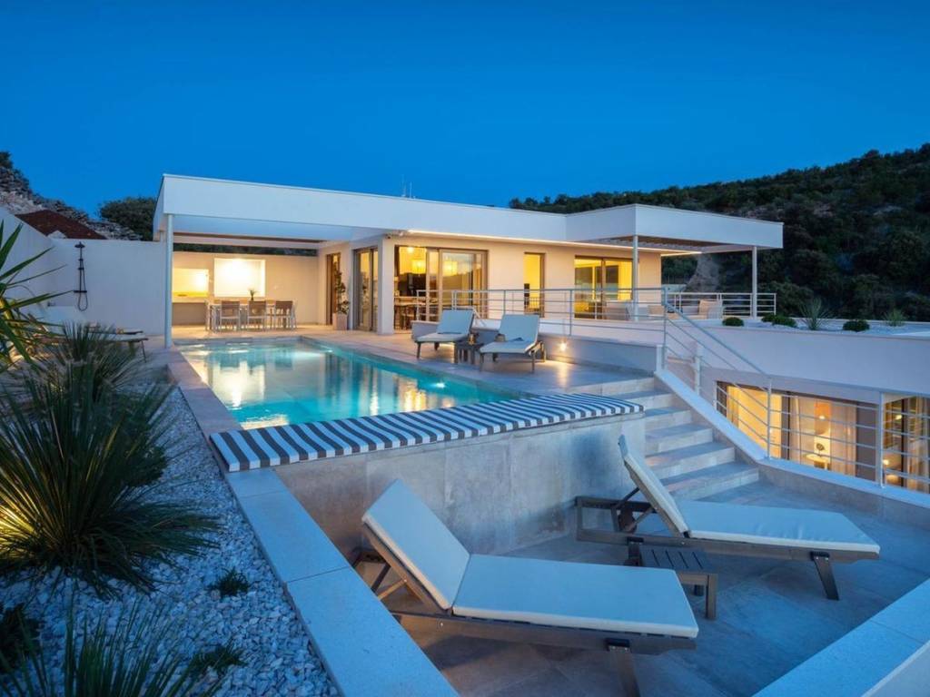 Newly built house located on a plot of 727m2, in a quiet location near the sea, in a small bay near Rogoznica. It is located on an elevated position with an accessible road, surrounded by landscaped, cultivated garden and terraces overlooking the sea. Airy and bright interiors are well equipped and spread over the ground floor and two floors connected by internal staircase. On the ground floor there is a garage with a storage room, a small gym, a bathroom and a space with a jacuzzi. The first floor consists of four spacious bedrooms with bathrooms, exit to the balcony that extends the length of the whole house and access to a small terrace that offers sea views. On the last floor there is a toilet, kitchen, dining room and living room with access to a large terrace ideal for relaxing and socializing. with heated pool and barbecue. The whole house is equipped and furnished with selected furniture and air conditioned (cooling and heating). Underfloor heating is located on the first and last floors. The house is ideal for vacations, living in a quiet location as well as for tourist rental. The nearest beach is only 100m away from the house, while other beaches are up to 1km away. Split Airport is 25 km away.
